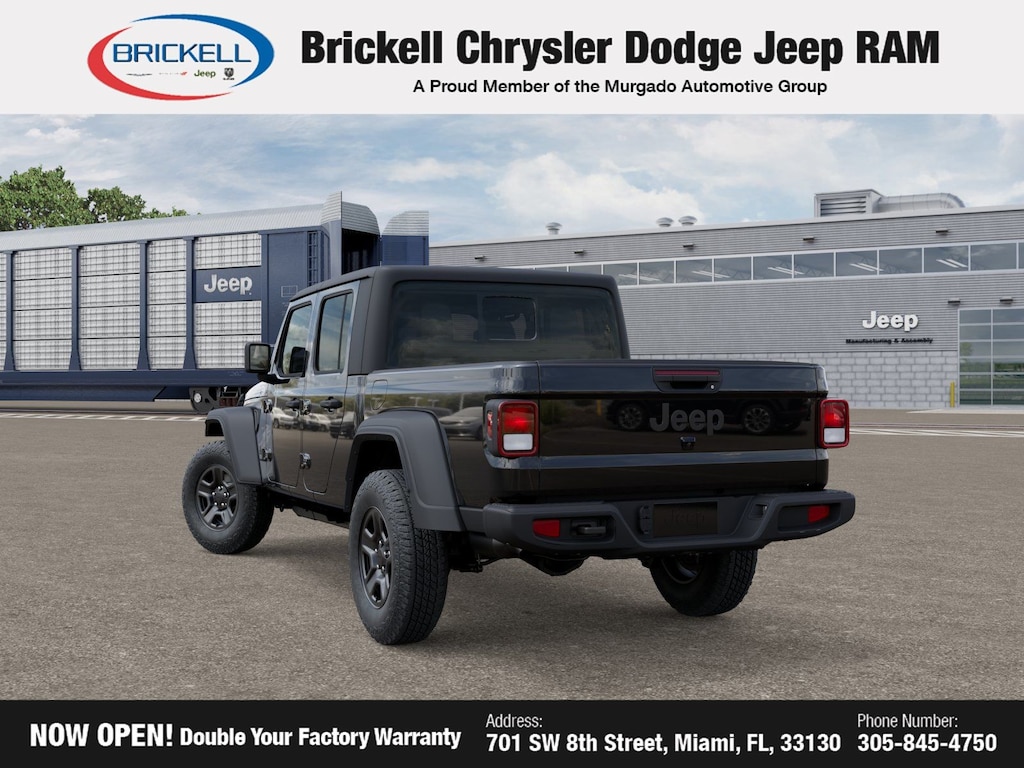 Price includes: $1500 - 2026 National Stellantis Loyalty Retail Bonus Cash . Exp. 02/02/2026 Discover Your Next Vehicle at Brickell Chrysler Dodge Jeep Ram Welcome to Brickell CDJR, where we go beyond selling cars. We double the factory powertrain warranty, giving you added peace of mind. Our dealership offers one of the largest new car inventories in the region, ensuring you find the right vehicle Prices displayed do not included our Perma-plate. Our state-of-the-art service department is the largest in the country and is open seven days a week from 7 AM to 9 PM. Visit us at 701 SW 8th St, Miami, FL 33130, or call 305-777-2800 to learn more and schedule a test drive. The displayed price includes an incentive for financing with Brickell CDJR Finance Company. Outside financing and bank drafts are not accepted. All pre-owned vehicle exports are subject to an export fee. Prices apply only to customers who live, work, or worship in Broward, Miami-Dade, Palm Beach, Monroe, Collier, Hendry, Lee, Glades, Martin, St. Lucie, Okeechobee, Manatee, Hillsborough, Osceola, or Orange County. Customers outside these counties will pay an additional $ Taxes, title, registration, and dealer fees apply. Factory MSRP: $46,035 Black Clearcoat 2026 Jeep Gladiator Sport 4WD 8-Speed Automatic 3.6L V6 24V VVT