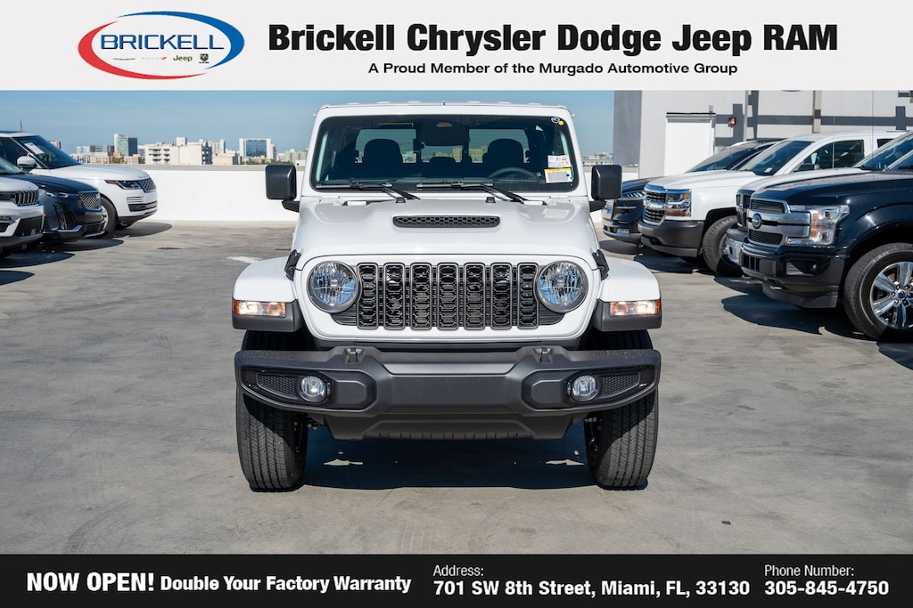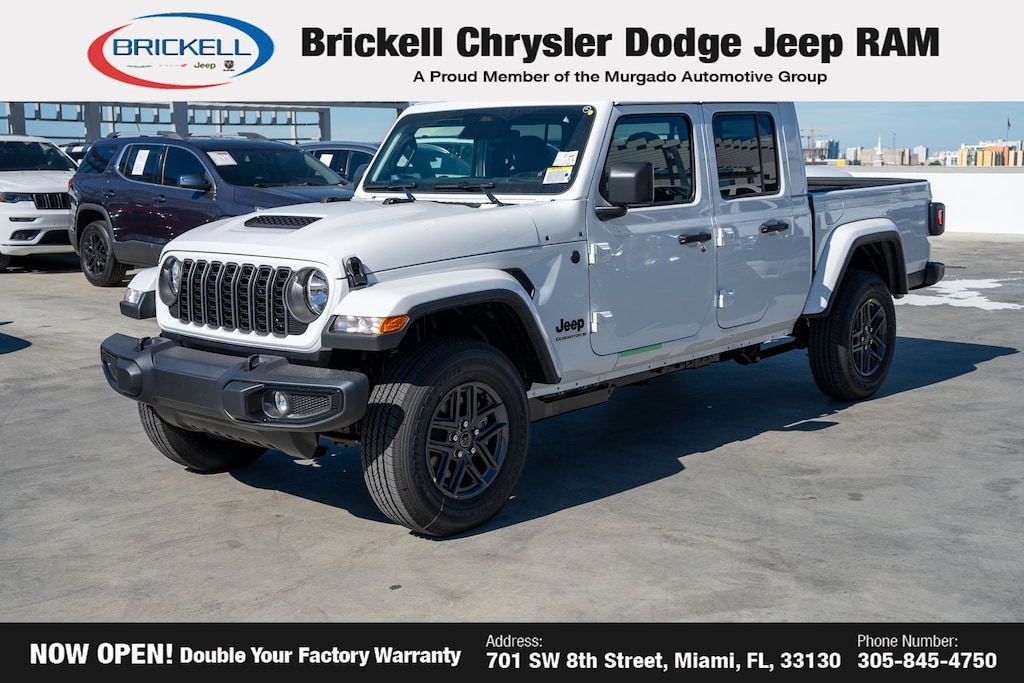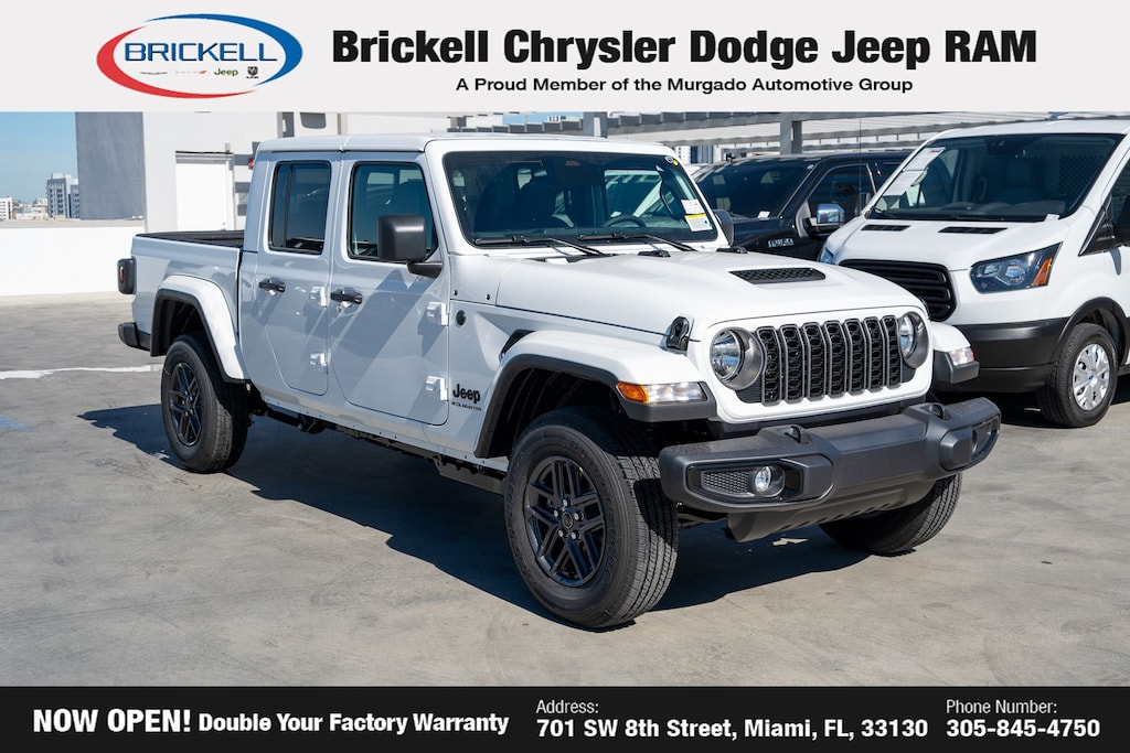 Price includes: $1500 - 2026 National Stellantis Loyalty Retail Bonus Cash . Exp. 02/02/2026 Discover Your Next Vehicle at Brickell Chrysler Dodge Jeep Ram Welcome to Brickell CDJR, where we go beyond selling cars. We double the factory powertrain warranty, giving you added peace of mind. Our dealership offers one of the largest new car inventories in the region, ensuring you find the right vehicle Prices displayed do not included our Perma-plate. Our state-of-the-art service department is the largest in the country and is open seven days a week from 7 AM to 9 PM. Visit us at 701 SW 8th St, Miami, FL 33130, or call 305-777-2800 to learn more and schedule a test drive. The displayed price includes an incentive for financing with Brickell CDJR Finance Company. Outside financing and bank drafts are not accepted. All pre-owned vehicle exports are subject to an export fee. Prices apply only to customers who live, work, or worship in Broward, Miami-Dade, Palm Beach, Monroe, Collier, Hendry, Lee, Glades, Martin, St. Lucie, Okeechobee, Manatee, Hillsborough, Osceola, or Orange County. Customers outside these counties will pay an additional $ Taxes, title, registration, and dealer fees apply. Factory MSRP: $47,635 Bright White Clearcoat 2026 Jeep Gladiator Sport S 4WD 8-Speed Automatic 3.6L V6 24V VVT