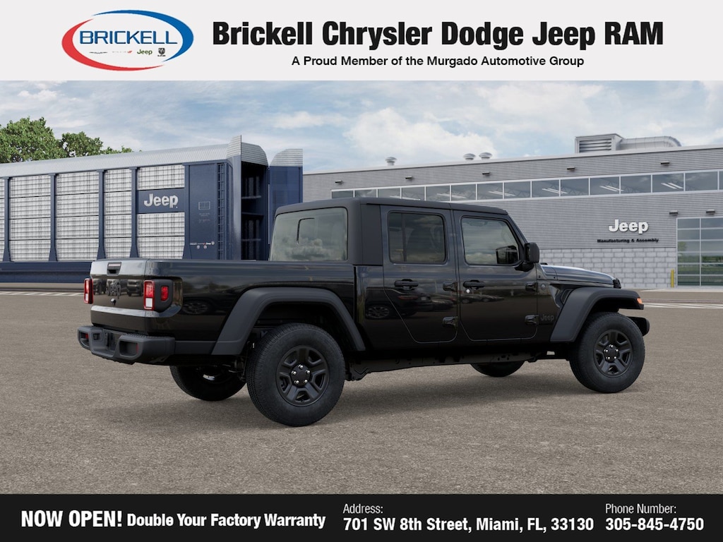 Price includes: $1500 - 2026 National Stellantis Loyalty Retail Bonus Cash . Exp. 02/02/2026 Discover Your Next Vehicle at Brickell Chrysler Dodge Jeep Ram Welcome to Brickell CDJR, where we go beyond selling cars. We double the factory powertrain warranty, giving you added peace of mind. Our dealership offers one of the largest new car inventories in the region, ensuring you find the right vehicle Prices displayed do not included our Perma-plate. Our state-of-the-art service department is the largest in the country and is open seven days a week from 7 AM to 9 PM. Visit us at 701 SW 8th St, Miami, FL 33130, or call 305-777-2800 to learn more and schedule a test drive. The displayed price includes an incentive for financing with Brickell CDJR Finance Company. Outside financing and bank drafts are not accepted. All pre-owned vehicle exports are subject to an export fee. Prices apply only to customers who live, work, or worship in Broward, Miami-Dade, Palm Beach, Monroe, Collier, Hendry, Lee, Glades, Martin, St. Lucie, Okeechobee, Manatee, Hillsborough, Osceola, or Orange County. Customers outside these counties will pay an additional $ Taxes, title, registration, and dealer fees apply. Factory MSRP: $44,040 Black Clearcoat 2026 Jeep Gladiator Sport 4WD 8-Speed Automatic 3.6L V6 24V VVT