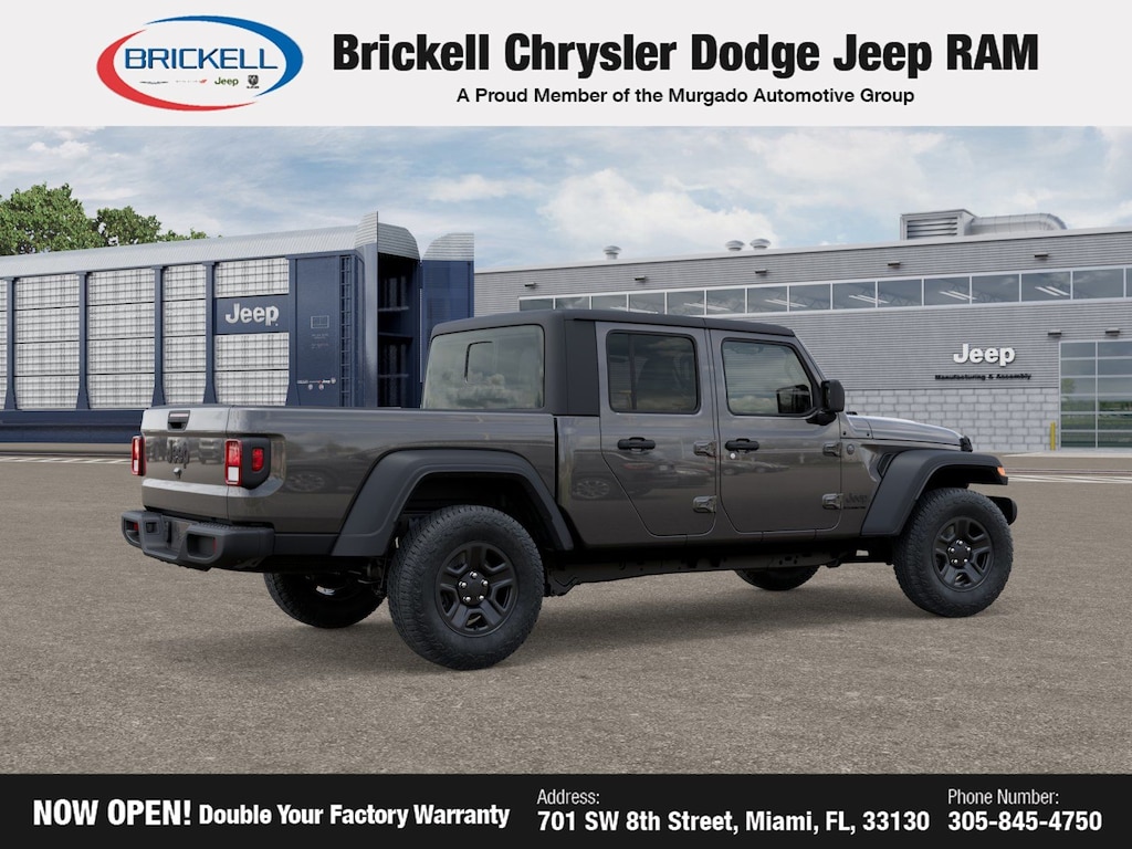 Price includes: $1500 - 2026 National Stellantis Loyalty Retail Bonus Cash . Exp. 02/02/2026 Discover Your Next Vehicle at Brickell Chrysler Dodge Jeep Ram Welcome to Brickell CDJR, where we go beyond selling cars. We double the factory powertrain warranty, giving you added peace of mind. Our dealership offers one of the largest new car inventories in the region, ensuring you find the right vehicle Prices displayed do not included our Perma-plate. Our state-of-the-art service department is the largest in the country and is open seven days a week from 7 AM to 9 PM. Visit us at 701 SW 8th St, Miami, FL 33130, or call 305-777-2800 to learn more and schedule a test drive. The displayed price includes an incentive for financing with Brickell CDJR Finance Company. Outside financing and bank drafts are not accepted. All pre-owned vehicle exports are subject to an export fee. Prices apply only to customers who live, work, or worship in Broward, Miami-Dade, Palm Beach, Monroe, Collier, Hendry, Lee, Glades, Martin, St. Lucie, Okeechobee, Manatee, Hillsborough, Osceola, or Orange County. Customers outside these counties will pay an additional $ Taxes, title, registration, and dealer fees apply. Factory MSRP: $46,035 Granite Crystal Metallic Clearcoat 2026 Jeep Gladiator Sport 4WD 8-Speed Automatic 3.6L V6 24V VVT
