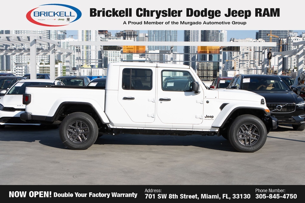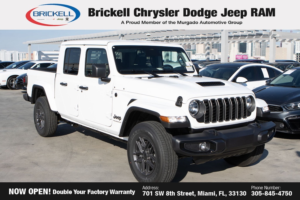 Price includes: $500 - National Select Inventory Retail Bonus Cash. Exp. 12/01/2025 Discover Your Next Vehicle at Brickell Chrysler Dodge Jeep Ram Welcome to Brickell CDJR, where we go beyond selling cars. We double the factory powertrain warranty, giving you added peace of mind. Our dealership offers one of the largest new car inventories in the region, ensuring you find the right vehicle Prices displayed do not included our Perma-plate. Our state-of-the-art service department is the largest in the country and is open seven days a week from 7 AM to 9 PM. Visit us at 701 SW 8th St, Miami, FL 33130, or call 305-777-2800 to learn more and schedule a test drive. The displayed price includes an incentive for financing with Brickell CDJR Finance Company. Outside financing and bank drafts are not accepted. All pre-owned vehicle exports are subject to an export fee. Prices apply only to customers who live, work, or worship in Broward, Miami-Dade, Palm Beach, Monroe, Collier, Hendry, Lee, Glades, Martin, St. Lucie, Okeechobee, Manatee, Hillsborough, Osceola, or Orange County. Customers outside these counties will pay an additional $ Taxes, title, registration, and dealer fees apply. Factory MSRP: $49,135 Bright White Clearcoat 2026 Jeep Gladiator Sport S 4WD 8-Speed Automatic 3.6L V6 24V VVT