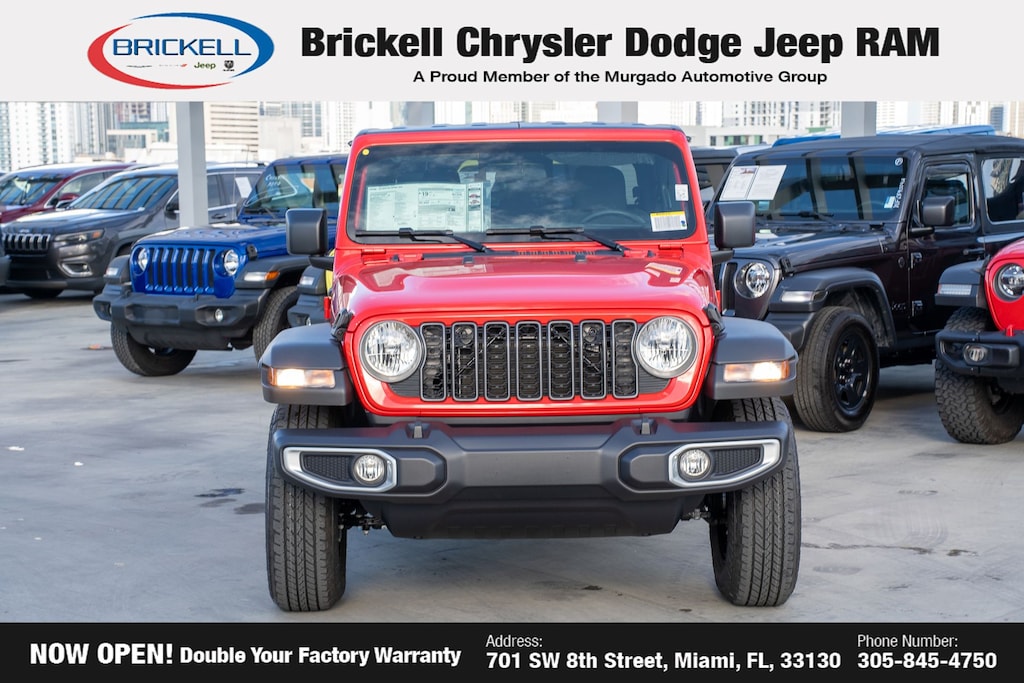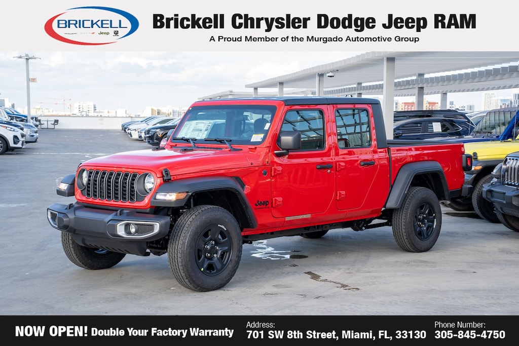 Price includes: $1500 - 2026 National Stellantis Loyalty Retail Bonus Cash . Exp. 02/02/2026 Discover Your Next Vehicle at Brickell Chrysler Dodge Jeep Ram Welcome to Brickell CDJR, where we go beyond selling cars. We double the factory powertrain warranty, giving you added peace of mind. Our dealership offers one of the largest new car inventories in the region, ensuring you find the right vehicle Prices displayed do not included our Perma-plate. Our state-of-the-art service department is the largest in the country and is open seven days a week from 7 AM to 9 PM. Visit us at 701 SW 8th St, Miami, FL 33130, or call 305-777-2800 to learn more and schedule a test drive. The displayed price includes an incentive for financing with Brickell CDJR Finance Company. Outside financing and bank drafts are not accepted. All pre-owned vehicle exports are subject to an export fee. Prices apply only to customers who live, work, or worship in Broward, Miami-Dade, Palm Beach, Monroe, Collier, Hendry, Lee, Glades, Martin, St. Lucie, Okeechobee, Manatee, Hillsborough, Osceola, or Orange County. Customers outside these counties will pay an additional $ Taxes, title, registration, and dealer fees apply. Factory MSRP: $45,440 firecracker red clearcoat 2026 Jeep Gladiator Sport 4WD 8-Speed Automatic 3.6L V6 24V VVT