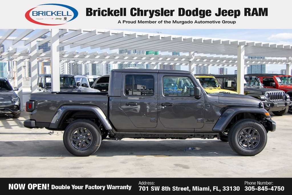 Price includes: $1500 - 2026 National Stellantis Loyalty Retail Bonus Cash . Exp. 02/02/2026 $500 - 2026 National Select Inventory Bonus Cash. Exp. 01/04/2027 Discover Your Next Vehicle at Brickell Chrysler Dodge Jeep Ram Welcome to Brickell CDJR, where we go beyond selling cars. We double the factory powertrain warranty, giving you added peace of mind. Our dealership offers one of the largest new car inventories in the region, ensuring you find the right vehicle Prices displayed do not included our Perma-plate. Our state-of-the-art service department is the largest in the country and is open seven days a week from 7 AM to 9 PM. Visit us at 701 SW 8th St, Miami, FL 33130, or call 305-777-2800 to learn more and schedule a test drive. The displayed price includes an incentive for financing with Brickell CDJR Finance Company. Outside financing and bank drafts are not accepted. All pre-owned vehicle exports are subject to an export fee. Prices apply only to customers who live, work, or worship in Broward, Miami-Dade, Palm Beach, Monroe, Collier, Hendry, Lee, Glades, Martin, St. Lucie, Okeechobee, Manatee, Hillsborough, Osceola, or Orange County. Customers outside these counties will pay an additional $ Taxes, title, registration, and dealer fees apply. Factory MSRP: $49,730 Granite Crystal Metallic Clearcoat 2026 Jeep Gladiator Sport S 4WD 8-Speed Automatic 3.6L V6 24V VVT