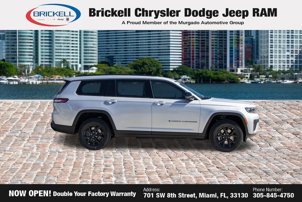 Price includes: $1500 - 2026 National Retail Bonus Cash . Exp. 04/30/2026 Discover Your Next Vehicle at Brickell Chrysler Dodge Jeep Ram Welcome to Brickell CDJR, where we go beyond selling cars. We double the factory powertrain warranty, giving you added peace of mind. Our dealership offers one of the largest new car inventories in the region, ensuring you find the right vehicle Prices displayed do not included our Perma-plate. Our state-of-the-art service department is the largest in the country and is open seven days a week from 7 AM to 9 PM. Visit us at 701 SW 8th St, Miami, FL 33130, or call 305-777-2800 to learn more and schedule a test drive. The displayed price includes an incentive for financing with Brickell CDJR Finance Company. Outside financing and bank drafts are not accepted. All pre-owned vehicle exports are subject to an export fee. Prices apply only to customers who live, work, or worship in Broward, Miami-Dade, Palm Beach, Monroe, Collier, Hendry, Lee, Glades, Martin, St. Lucie, Okeechobee, Manatee, Hillsborough, Osceola, or Orange County. Customers outside these counties will pay an additional $ Taxes, title, registration, and dealer fees apply. Factory MSRP: $50,445 Silver Zynith 2026 Jeep Grand Cherokee L Laredo 4WD 8-Speed Automatic 2.0L Hurricane 4 Turbo with ESS