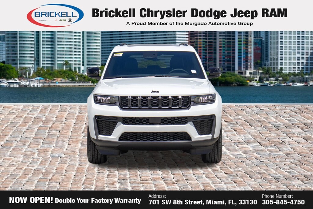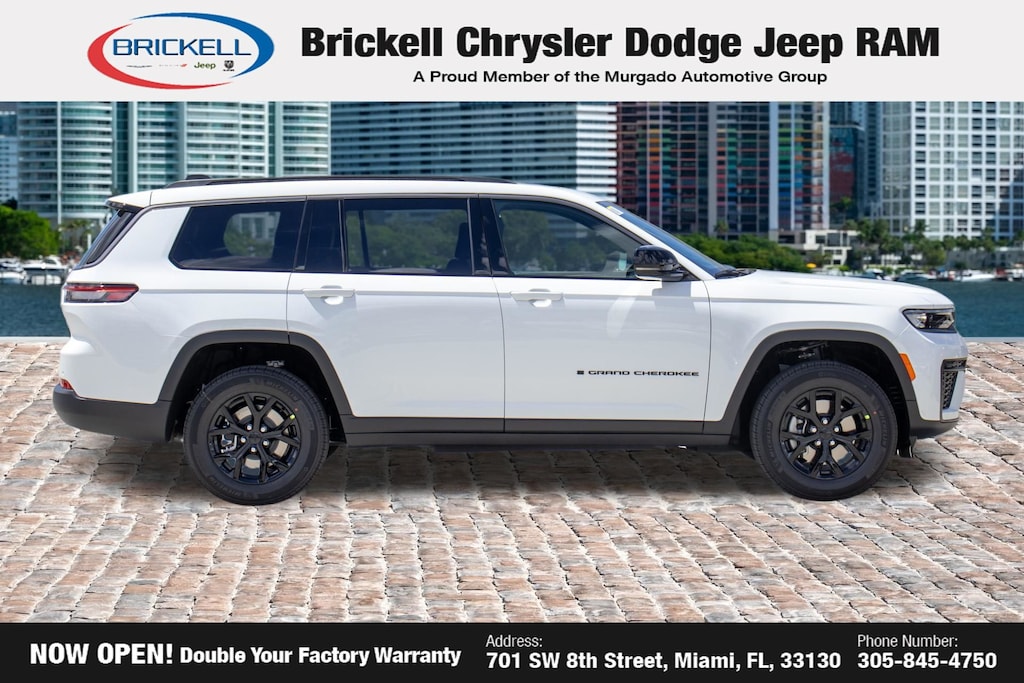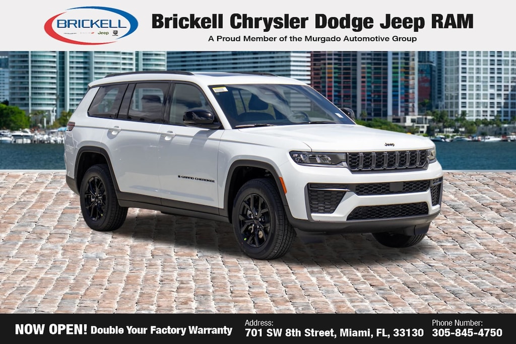 Price includes: $1000 - 2026 National Stellantis Loyalty Bonus Cash . Exp. 04/30/2026 $1500 - 2026 National Retail Bonus Cash . Exp. 04/30/2026 $500 - 2026 National 2026 Military Bonus Cash . Exp. 01/04/2027 Discover Your Next Vehicle at Brickell Chrysler Dodge Jeep Ram Welcome to Brickell CDJR, where we go beyond selling cars. We double the factory powertrain warranty, giving you added peace of mind. Our dealership offers one of the largest new car inventories in the region, ensuring you find the right vehicle Prices displayed do not included our Perma-plate. Our state-of-the-art service department is the largest in the country and is open seven days a week from 7 AM to 9 PM. Visit us at 701 SW 8th St, Miami, FL 33130, or call 305-777-2800 to learn more and schedule a test drive. The displayed price includes an incentive for financing with Brickell CDJR Finance Company. Outside financing and bank drafts are not accepted. All pre-owned vehicle exports are subject to an export fee. Prices apply only to customers who live, work, or worship in Broward, Miami-Dade, Palm Beach, Monroe, Collier, Hendry, Lee, Glades, Martin, St. Lucie, Okeechobee, Manatee, Hillsborough, Osceola, or Orange County. Customers outside these counties will pay an additional $ Taxes, title, registration, and dealer fees apply. Factory MSRP: $50,350 Bright White Clearcoat 2026 Jeep Grand Cherokee L Laredo 4WD 8-Speed Automatic 2.0L Hurricane 4 Turbo with ESS