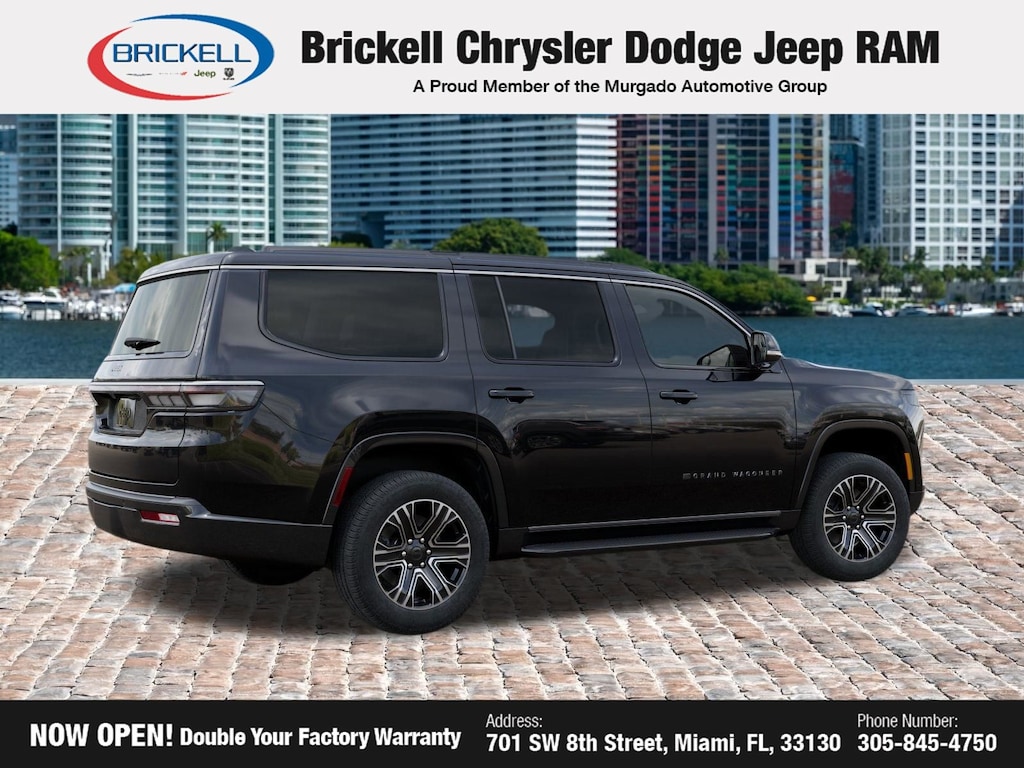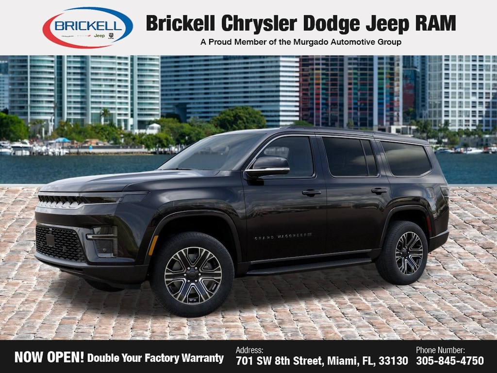Discover Your Next Vehicle at Brickell Chrysler Dodge Jeep Ram Welcome to Brickell CDJR, where we go beyond selling cars. We double the factory powertrain warranty, giving you added peace of mind. Our dealership offers one of the largest new car inventories in the region, ensuring you find the right vehicle Prices displayed do not included our Perma-plate. Our state-of-the-art service department is the largest in the country and is open seven days a week from 7 AM to 9 PM. Visit us at 701 SW 8th St, Miami, FL 33130, or call 305-777-2800 to learn more and schedule a test drive. The displayed price includes an incentive for financing with Brickell CDJR Finance Company. Outside financing and bank drafts are not accepted. All pre-owned vehicle exports are subject to an export fee. Prices apply only to customers who live, work, or worship in Broward, Miami-Dade, Palm Beach, Monroe, Collier, Hendry, Lee, Glades, Martin, St. Lucie, Okeechobee, Manatee, Hillsborough, Osceola, or Orange County. Customers outside these counties will pay an additional $ Taxes, title, registration, and dealer fees apply. Factory MSRP: $67,325 High Gloss Black 2026 Jeep Grand Wagoneer RWD 8-Speed Automatic 3.0L I6