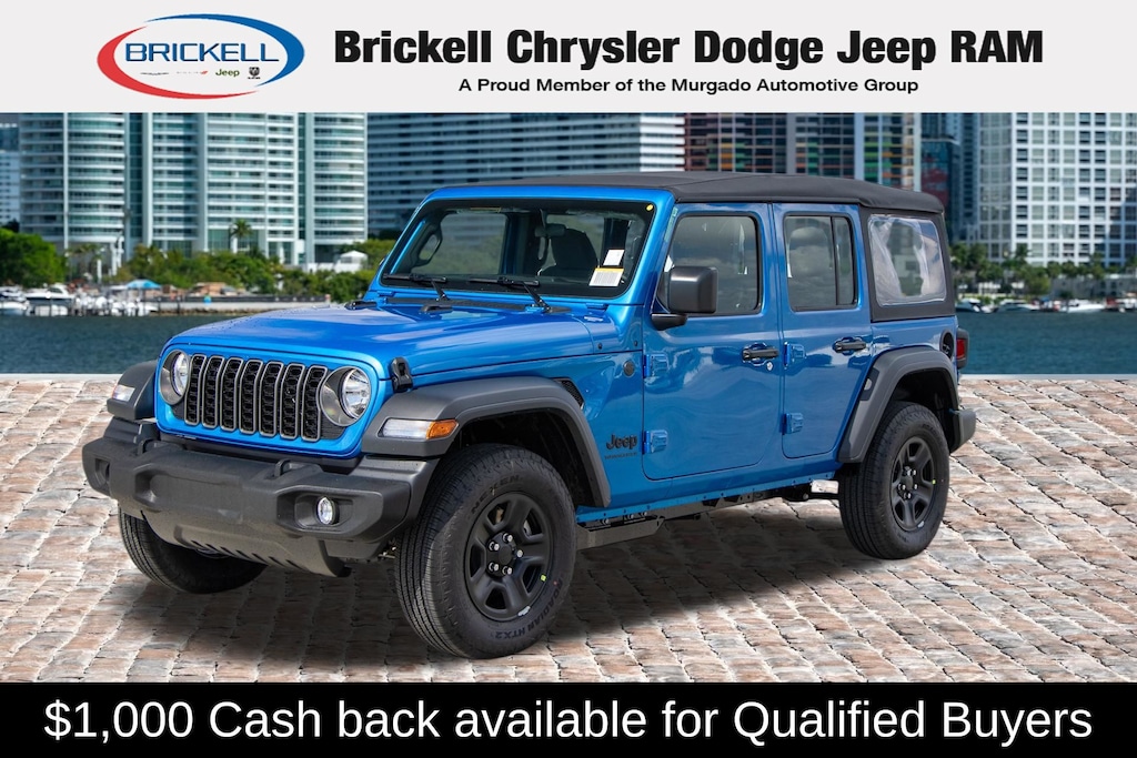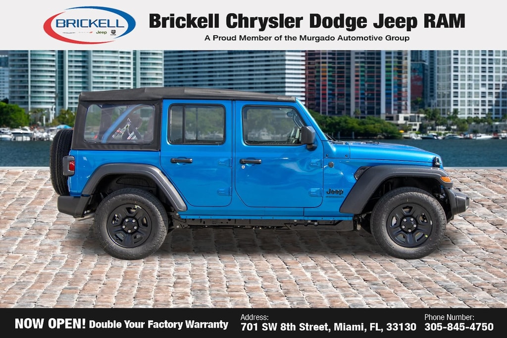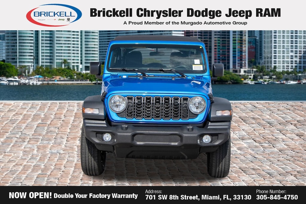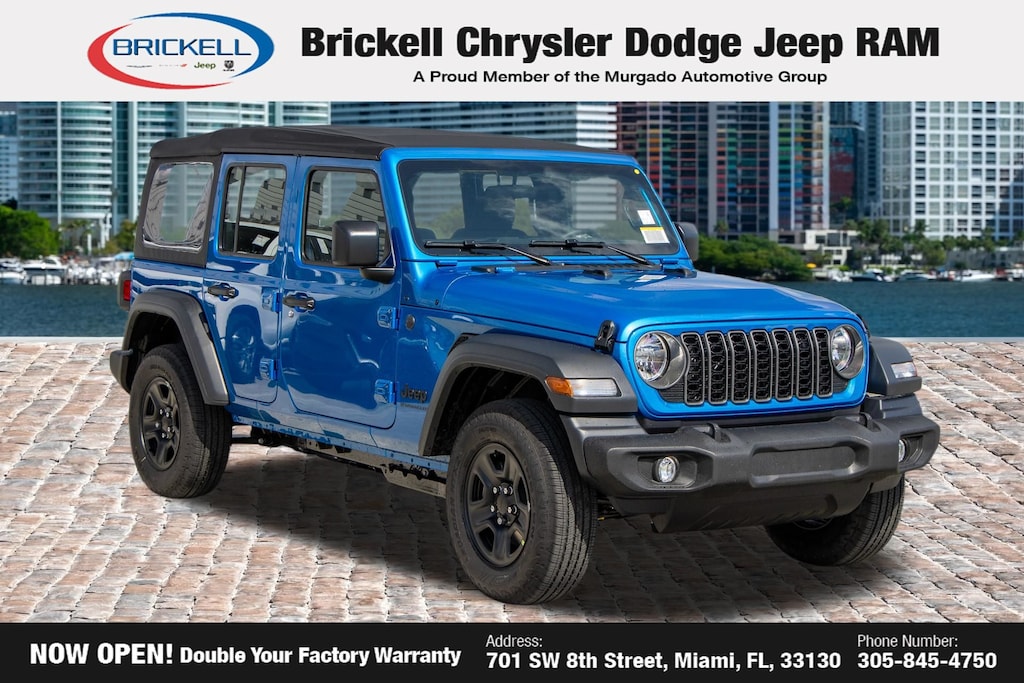 Price includes: $1000 - 2026 National Retail Bonus Cash . Exp. 04/30/2026 Discover Your Next Vehicle at Brickell Chrysler Dodge Jeep Ram Welcome to Brickell CDJR, where we go beyond selling cars. We double the factory powertrain warranty, giving you added peace of mind. Our dealership offers one of the largest new car inventories in the region, ensuring you find the right vehicle Prices displayed do not included our Perma-plate. Our state-of-the-art service department is the largest in the country and is open seven days a week from 7 AM to 9 PM. Visit us at 701 SW 8th St, Miami, FL 33130, or call 305-777-2800 to learn more and schedule a test drive. The displayed price includes an incentive for financing with Brickell CDJR Finance Company. Outside financing and bank drafts are not accepted. All pre-owned vehicle exports are subject to an export fee. Prices apply only to customers who live, work, or worship in Broward, Miami-Dade, Palm Beach, Monroe, Collier, Hendry, Lee, Glades, Martin, St. Lucie, Okeechobee, Manatee, Hillsborough, Osceola, or Orange County. Customers outside these counties will pay an additional $ Taxes, title, registration, and dealer fees apply. Factory MSRP: $42,595 Hydro Blue Pearl Coat 2026 Jeep Wrangler Sport 4WD 8-Speed Automatic 2.0L I4 DOHC
