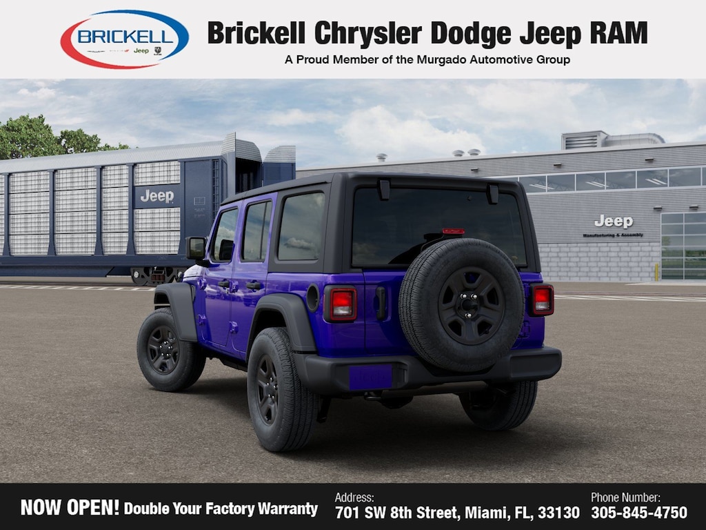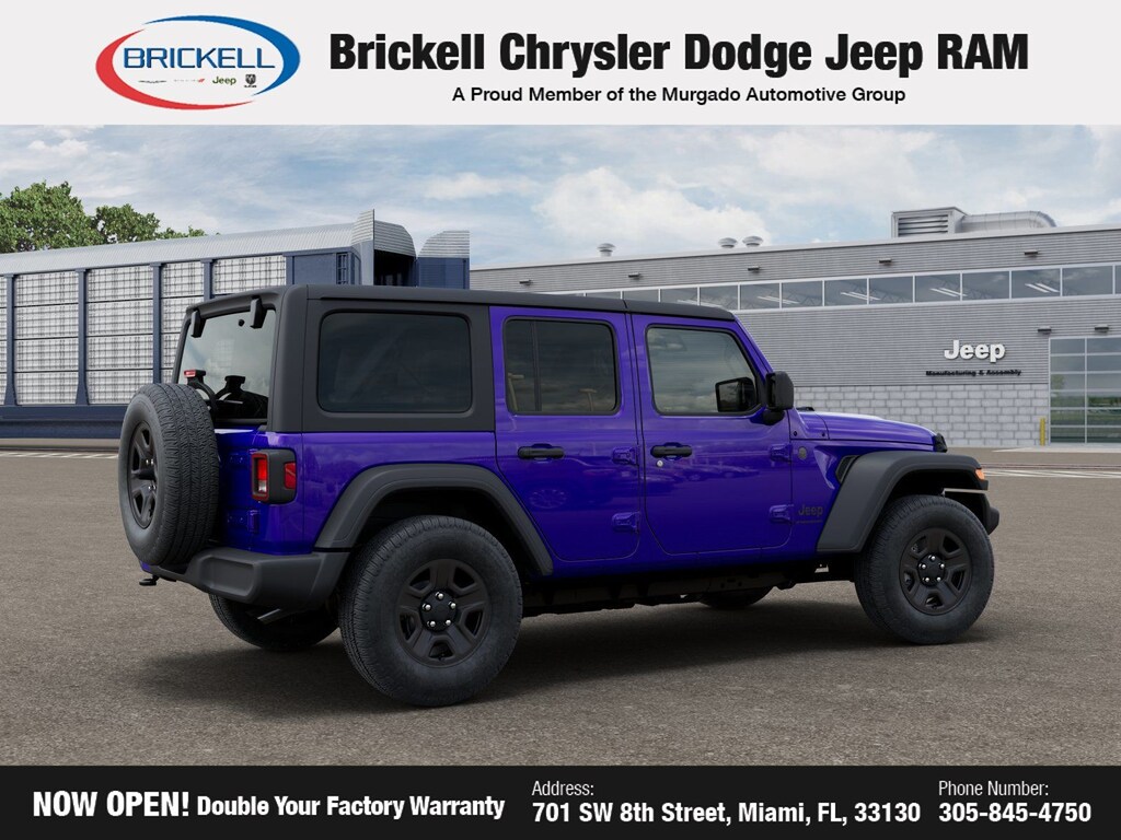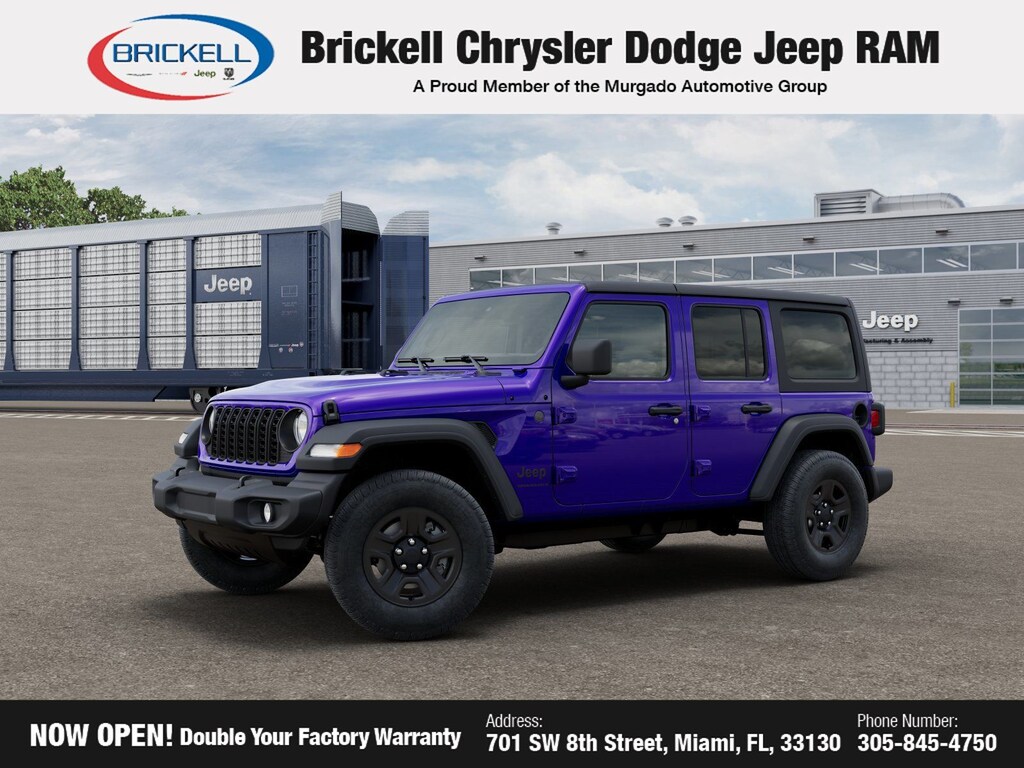Price includes: $500 - 2026 National 2026 Military Bonus Cash . Exp. 01/04/2027 Discover Your Next Vehicle at Brickell Chrysler Dodge Jeep Ram Welcome to Brickell CDJR, where we go beyond selling cars. We double the factory powertrain warranty, giving you added peace of mind. Our dealership offers one of the largest new car inventories in the region, ensuring you find the right vehicle Prices displayed do not included our Perma-plate. Our state-of-the-art service department is the largest in the country and is open seven days a week from 7 AM to 9 PM. Visit us at 701 SW 8th St, Miami, FL 33130, or call 305-777-2800 to learn more and schedule a test drive. The displayed price includes an incentive for financing with Brickell CDJR Finance Company. Outside financing and bank drafts are not accepted. All pre-owned vehicle exports are subject to an export fee. Prices apply only to customers who live, work, or worship in Broward, Miami-Dade, Palm Beach, Monroe, Collier, Hendry, Lee, Glades, Martin, St. Lucie, Okeechobee, Manatee, Hillsborough, Osceola, or Orange County. Customers outside these counties will pay an additional $ Taxes, title, registration, and dealer fees apply. Factory MSRP: $45,385 Reign 2026 Jeep Wrangler Sport 4WD 8-Speed Automatic 2.0L I4 DOHC