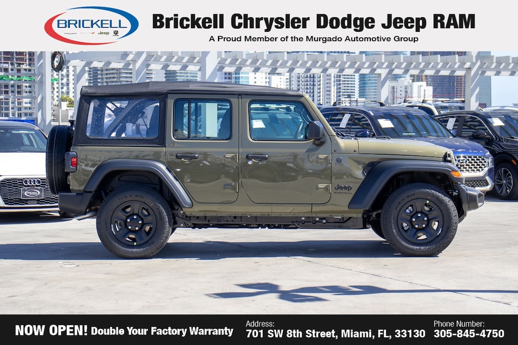 Price includes: $1000 - 2026 National Retail Bonus Cash . Exp. 04/30/2026 $1000 - 2026 National Stellantis Loyalty Bonus Cash . Exp. 04/30/2026 $500 - 2026 National 2026 Military Bonus Cash . Exp. 01/04/2027 Discover Your Next Vehicle at Brickell Chrysler Dodge Jeep Ram Welcome to Brickell CDJR, where we go beyond selling cars. We double the factory powertrain warranty, giving you added peace of mind. Our dealership offers one of the largest new car inventories in the region, ensuring you find the right vehicle Prices displayed do not included our Perma-plate. Our state-of-the-art service department is the largest in the country and is open seven days a week from 7 AM to 9 PM. Visit us at 701 SW 8th St, Miami, FL 33130, or call 305-777-2800 to learn more and schedule a test drive. The displayed price includes an incentive for financing with Brickell CDJR Finance Company. Outside financing and bank drafts are not accepted. All pre-owned vehicle exports are subject to an export fee. Prices apply only to customers who live, work, or worship in Broward, Miami-Dade, Palm Beach, Monroe, Collier, Hendry, Lee, Glades, Martin, St. Lucie, Okeechobee, Manatee, Hillsborough, Osceola, or Orange County. Customers outside these counties will pay an additional $ Taxes, title, registration, and dealer fees apply. Factory MSRP: $43,265 41 2026 Jeep Wrangler Sport 4WD 8-Speed Automatic 2.0L I4 DOHC