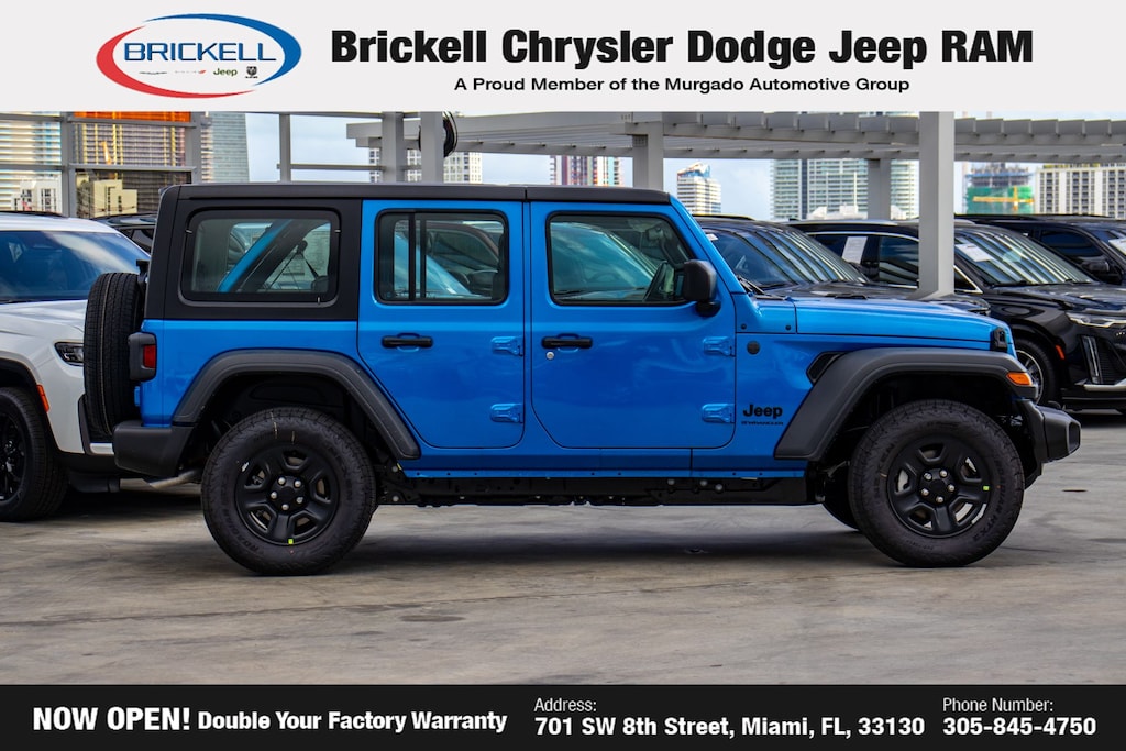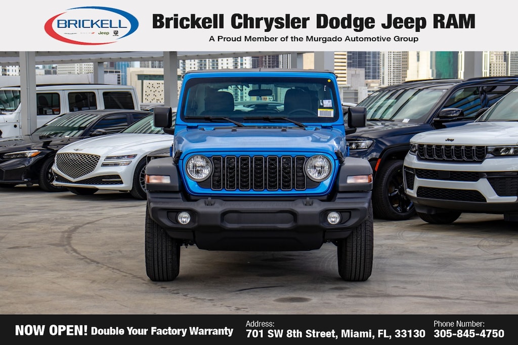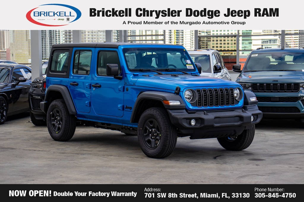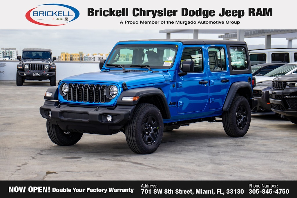 Price includes: $1000 - 2026 National Retail Bonus Cash . Exp. 04/30/2026 $1000 - 2026 National Stellantis Loyalty Bonus Cash . Exp. 04/30/2026 $500 - 2026 National 2026 Military Bonus Cash . Exp. 01/04/2027 Discover Your Next Vehicle at Brickell Chrysler Dodge Jeep Ram Welcome to Brickell CDJR, where we go beyond selling cars. We double the factory powertrain warranty, giving you added peace of mind. Our dealership offers one of the largest new car inventories in the region, ensuring you find the right vehicle Prices displayed do not included our Perma-plate. Our state-of-the-art service department is the largest in the country and is open seven days a week from 7 AM to 9 PM. Visit us at 701 SW 8th St, Miami, FL 33130, or call 305-777-2800 to learn more and schedule a test drive. The displayed price includes an incentive for financing with Brickell CDJR Finance Company. Outside financing and bank drafts are not accepted. All pre-owned vehicle exports are subject to an export fee. Prices apply only to customers who live, work, or worship in Broward, Miami-Dade, Palm Beach, Monroe, Collier, Hendry, Lee, Glades, Martin, St. Lucie, Okeechobee, Manatee, Hillsborough, Osceola, or Orange County. Customers outside these counties will pay an additional $ Taxes, title, registration, and dealer fees apply. Factory MSRP: $44,990 Hydro Blue Pearl Coat 2026 Jeep Wrangler Sport 4WD 8-Speed Automatic 2.0L I4 DOHC