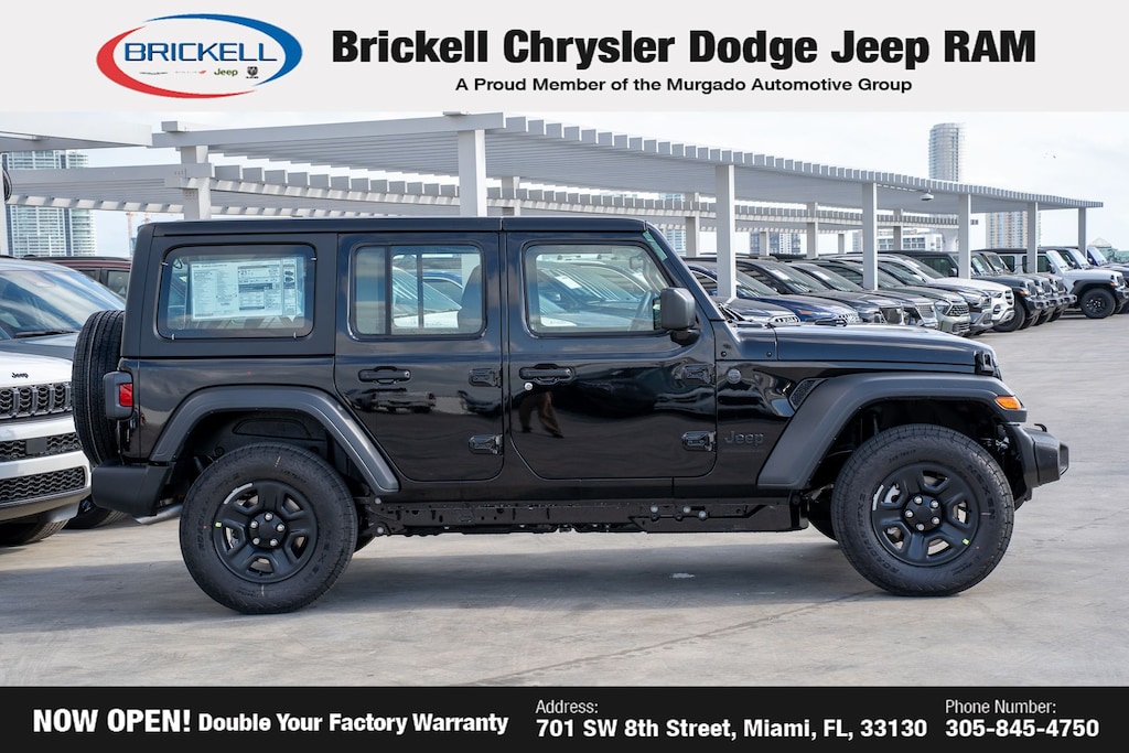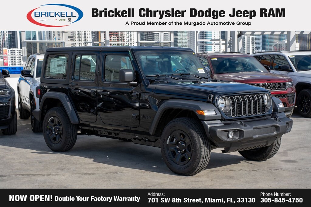 Price includes: $1000 - 2026 National Retail Bonus Cash . Exp. 04/30/2026 $1000 - 2026 National Stellantis Loyalty Bonus Cash . Exp. 04/30/2026 $500 - 2026 National 2026 Military Bonus Cash . Exp. 01/04/2027 Discover Your Next Vehicle at Brickell Chrysler Dodge Jeep Ram Welcome to Brickell CDJR, where we go beyond selling cars. We double the factory powertrain warranty, giving you added peace of mind. Our dealership offers one of the largest new car inventories in the region, ensuring you find the right vehicle Prices displayed do not included our Perma-plate. Our state-of-the-art service department is the largest in the country and is open seven days a week from 7 AM to 9 PM. Visit us at 701 SW 8th St, Miami, FL 33130, or call 305-777-2800 to learn more and schedule a test drive. The displayed price includes an incentive for financing with Brickell CDJR Finance Company. Outside financing and bank drafts are not accepted. All pre-owned vehicle exports are subject to an export fee. Prices apply only to customers who live, work, or worship in Broward, Miami-Dade, Palm Beach, Monroe, Collier, Hendry, Lee, Glades, Martin, St. Lucie, Okeechobee, Manatee, Hillsborough, Osceola, or Orange County. Customers outside these counties will pay an additional $ Taxes, title, registration, and dealer fees apply. Factory MSRP: $45,585 Black Clearcoat 2026 Jeep Wrangler Sport 4WD 8-Speed Automatic 2.0L I4 DOHC