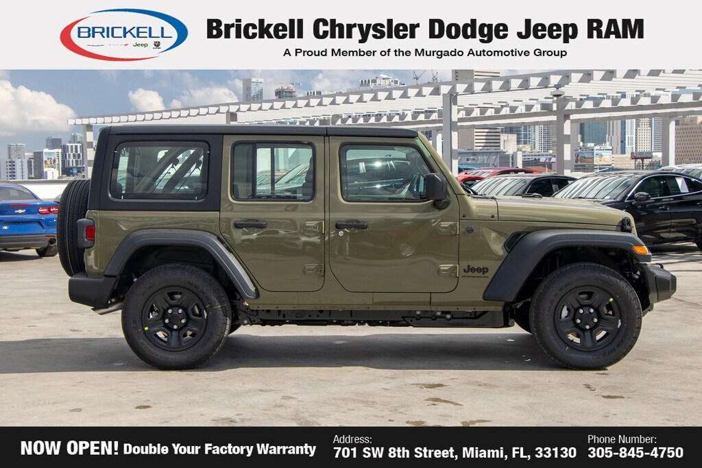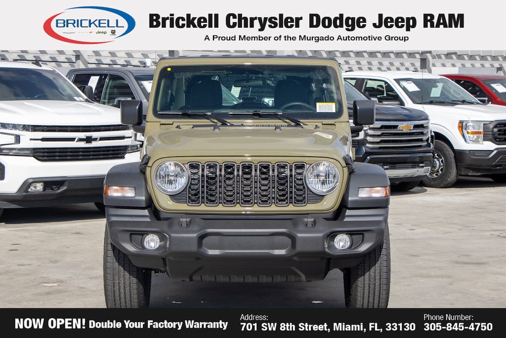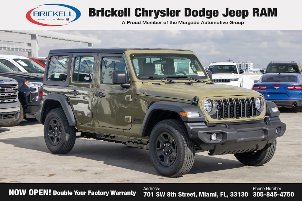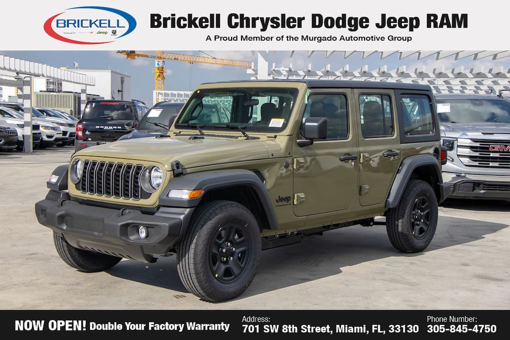 Price includes: $1000 - 2026 National Retail Bonus Cash . Exp. 04/30/2026 $1000 - 2026 National Stellantis Loyalty Bonus Cash . Exp. 04/30/2026 $500 - 2026 National 2026 Military Bonus Cash . Exp. 01/04/2027 Discover Your Next Vehicle at Brickell Chrysler Dodge Jeep Ram Welcome to Brickell CDJR, where we go beyond selling cars. We double the factory powertrain warranty, giving you added peace of mind. Our dealership offers one of the largest new car inventories in the region, ensuring you find the right vehicle Prices displayed do not included our Perma-plate. Our state-of-the-art service department is the largest in the country and is open seven days a week from 7 AM to 9 PM. Visit us at 701 SW 8th St, Miami, FL 33130, or call 305-777-2800 to learn more and schedule a test drive. The displayed price includes an incentive for financing with Brickell CDJR Finance Company. Outside financing and bank drafts are not accepted. All pre-owned vehicle exports are subject to an export fee. Prices apply only to customers who live, work, or worship in Broward, Miami-Dade, Palm Beach, Monroe, Collier, Hendry, Lee, Glades, Martin, St. Lucie, Okeechobee, Manatee, Hillsborough, Osceola, or Orange County. Customers outside these counties will pay an additional $ Taxes, title, registration, and dealer fees apply. Factory MSRP: $45,585 41 2026 Jeep Wrangler Sport 4WD 8-Speed Automatic 2.0L I4 DOHC