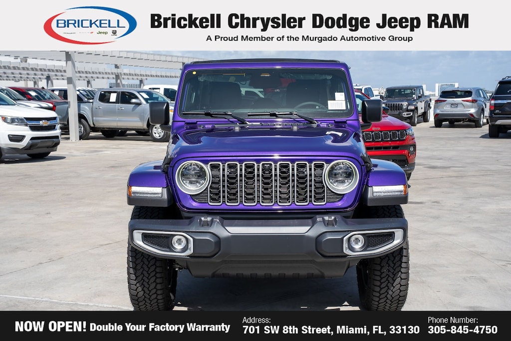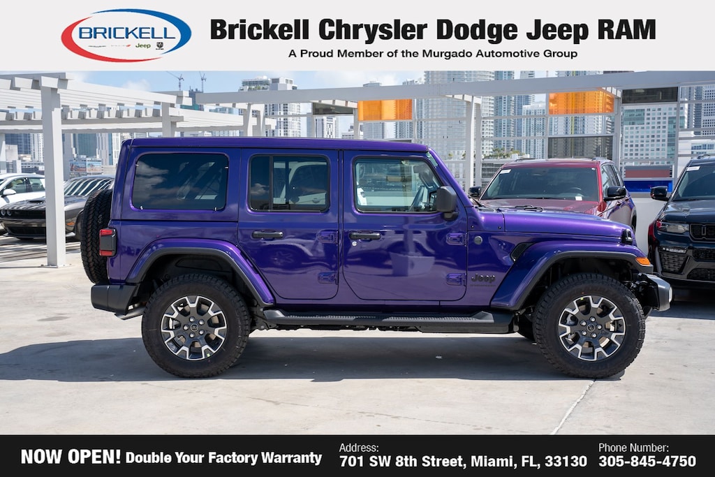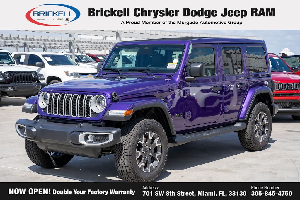 Price includes: $1000 - 2026 National Retail Bonus Cash . Exp. 03/31/2026 $1000 - 2026 National Stellantis Loyalty Bonus Cash . Exp. 03/31/2026 $500 - 2026 National 2026 Military Bonus Cash . Exp. 01/04/2027 Discover Your Next Vehicle at Brickell Chrysler Dodge Jeep Ram Welcome to Brickell CDJR, where we go beyond selling cars. We double the factory powertrain warranty, giving you added peace of mind. Our dealership offers one of the largest new car inventories in the region, ensuring you find the right vehicle Prices displayed do not included our Perma-plate. Our state-of-the-art service department is the largest in the country and is open seven days a week from 7 AM to 9 PM. Visit us at 701 SW 8th St, Miami, FL 33130, or call 305-777-2800 to learn more and schedule a test drive. The displayed price includes an incentive for financing with Brickell CDJR Finance Company. Outside financing and bank drafts are not accepted. All pre-owned vehicle exports are subject to an export fee. Prices apply only to customers who live, work, or worship in Broward, Miami-Dade, Palm Beach, Monroe, Collier, Hendry, Lee, Glades, Martin, St. Lucie, Okeechobee, Manatee, Hillsborough, Osceola, or Orange County. Customers outside these counties will pay an additional $ Taxes, title, registration, and dealer fees apply. Factory MSRP: $57,615 Reign 2026 Jeep Wrangler Sahara 4WD 8-Speed Automatic 2.0L I4 DOHC