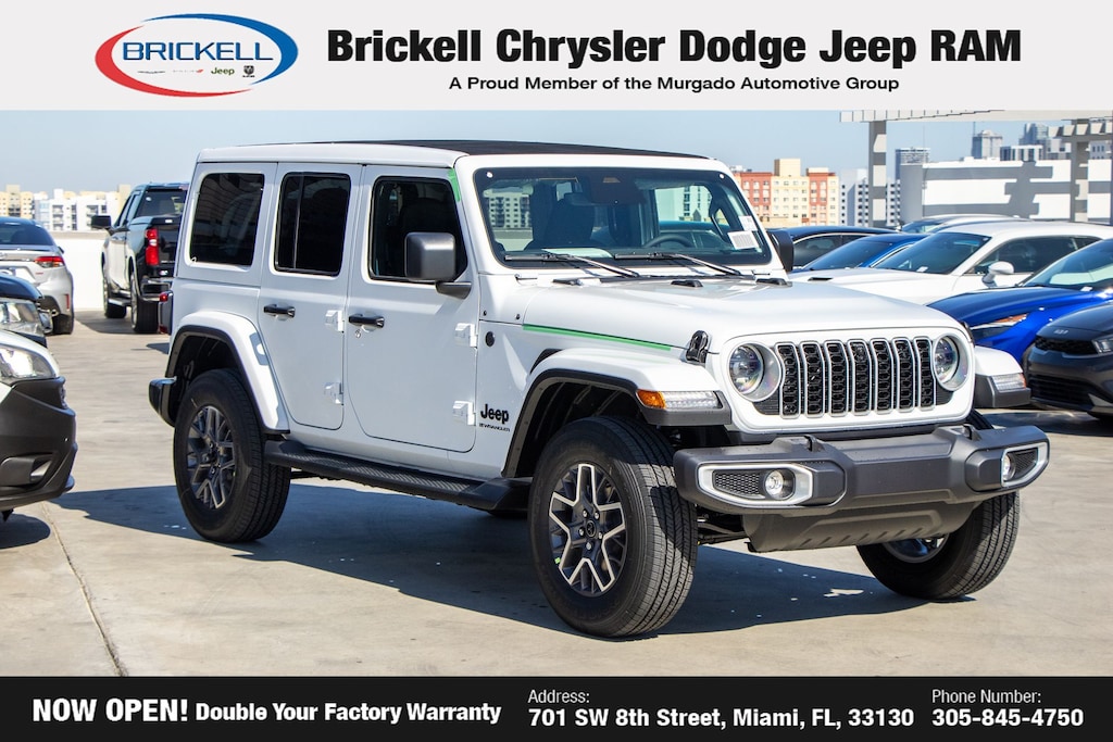 Price includes: $1500 - 2026 National Retail Bonus Cash . Exp. 11/03/2025 Discover Your Next Vehicle at Brickell Chrysler Dodge Jeep Ram Welcome to Brickell CDJR, where we go beyond selling cars. We double the factory powertrain warranty, giving you added peace of mind. Our dealership offers one of the largest new car inventories in the region, ensuring you find the right vehicle Prices displayed do not included our Perma-plate. Our state-of-the-art service department is the largest in the country and is open seven days a week from 7 AM to 9 PM. Visit us at 701 SW 8th St, Miami, FL 33130, or call 305-777-2800 to learn more and schedule a test drive. The displayed price includes an incentive for financing with Brickell CDJR Finance Company. Outside financing and bank drafts are not accepted. All pre-owned vehicle exports are subject to an export fee. Prices apply only to customers who live, work, or worship in Broward, Miami-Dade, Palm Beach, Monroe, Collier, Hendry, Lee, Glades, Martin, St. Lucie, Okeechobee, Manatee, Hillsborough, Osceola, or Orange County. Customers outside these counties will pay an additional $ Taxes, title, registration, and dealer fees apply. Factory MSRP: $57,040 Bright White Clearcoat 2026 Jeep Wrangler Sahara 4WD 8-Speed Automatic 2.0L I4 DOHC