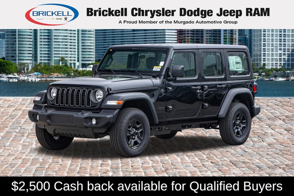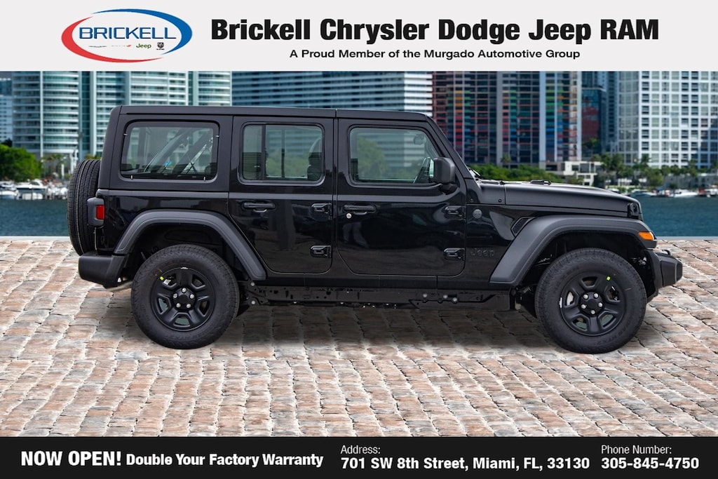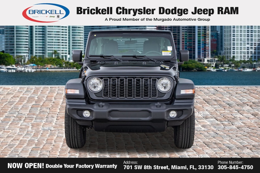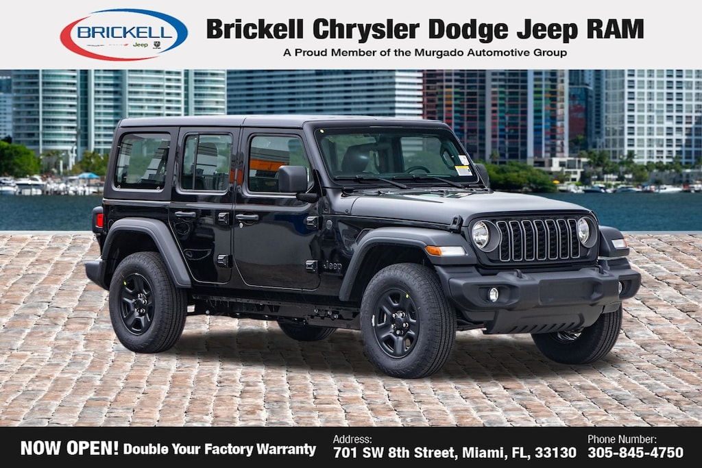 Price includes: $1000 - 2026 National Retail Bonus Cash . Exp. 04/30/2026 Discover Your Next Vehicle at Brickell Chrysler Dodge Jeep Ram Welcome to Brickell CDJR, where we go beyond selling cars. We double the factory powertrain warranty, giving you added peace of mind. Our dealership offers one of the largest new car inventories in the region, ensuring you find the right vehicle Prices displayed do not included our Perma-plate. Our state-of-the-art service department is the largest in the country and is open seven days a week from 7 AM to 9 PM. Visit us at 701 SW 8th St, Miami, FL 33130, or call 305-777-2800 to learn more and schedule a test drive. The displayed price includes an incentive for financing with Brickell CDJR Finance Company. Outside financing and bank drafts are not accepted. All pre-owned vehicle exports are subject to an export fee. Prices apply only to customers who live, work, or worship in Broward, Miami-Dade, Palm Beach, Monroe, Collier, Hendry, Lee, Glades, Martin, St. Lucie, Okeechobee, Manatee, Hillsborough, Osceola, or Orange County. Customers outside these counties will pay an additional $ Taxes, title, registration, and dealer fees apply. Factory MSRP: $48,080 Black Clearcoat 2026 Jeep Wrangler Sport 4WD 8-Speed Automatic 3.6L V6 24V VVT