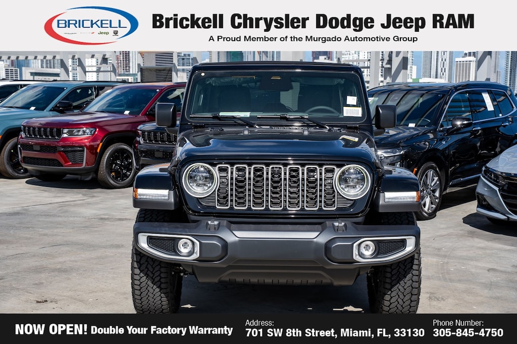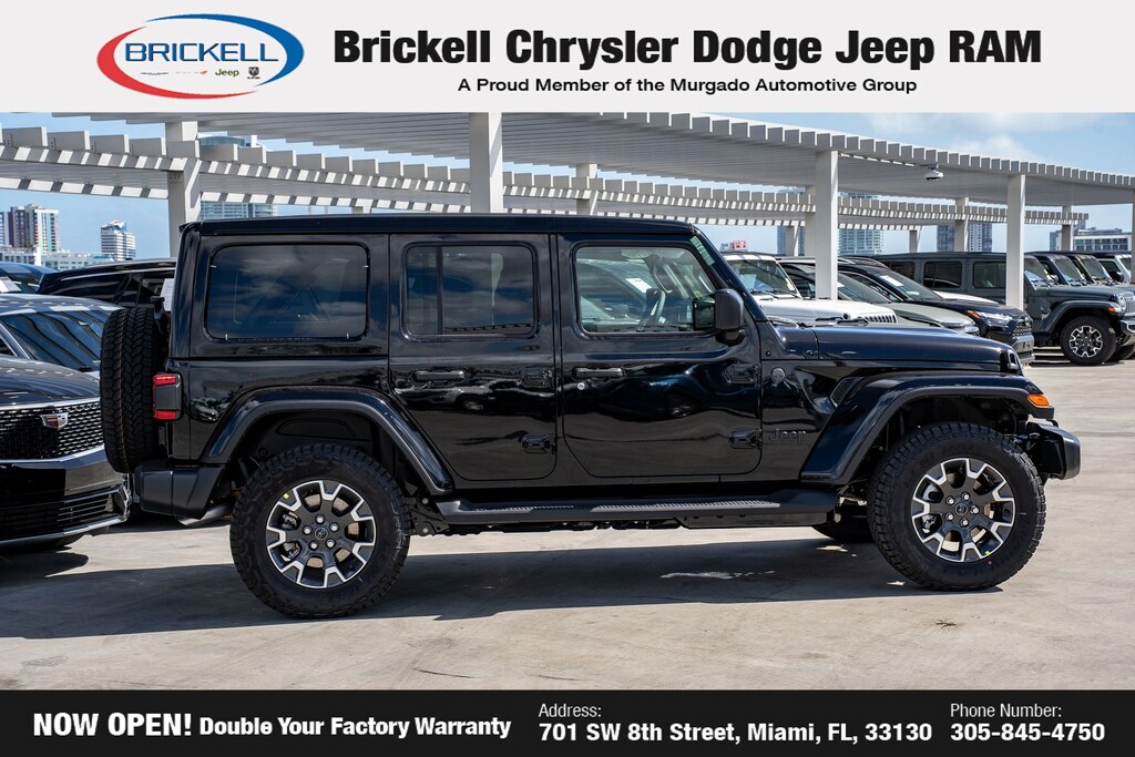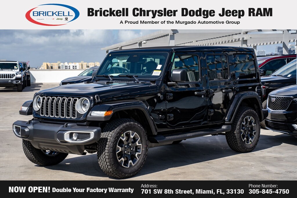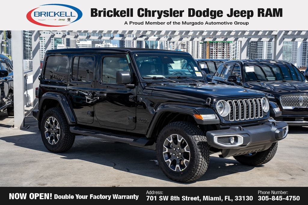 Price includes: $1000 - 2026 National Retail Bonus Cash . Exp. 03/31/2026 $1000 - 2026 National Stellantis Loyalty Bonus Cash . Exp. 03/31/2026 $500 - 2026 National 2026 Military Bonus Cash . Exp. 01/04/2027 Discover Your Next Vehicle at Brickell Chrysler Dodge Jeep Ram Welcome to Brickell CDJR, where we go beyond selling cars. We double the factory powertrain warranty, giving you added peace of mind. Our dealership offers one of the largest new car inventories in the region, ensuring you find the right vehicle Prices displayed do not included our Perma-plate. Our state-of-the-art service department is the largest in the country and is open seven days a week from 7 AM to 9 PM. Visit us at 701 SW 8th St, Miami, FL 33130, or call 305-777-2800 to learn more and schedule a test drive. The displayed price includes an incentive for financing with Brickell CDJR Finance Company. Outside financing and bank drafts are not accepted. All pre-owned vehicle exports are subject to an export fee. Prices apply only to customers who live, work, or worship in Broward, Miami-Dade, Palm Beach, Monroe, Collier, Hendry, Lee, Glades, Martin, St. Lucie, Okeechobee, Manatee, Hillsborough, Osceola, or Orange County. Customers outside these counties will pay an additional $ Taxes, title, registration, and dealer fees apply. Factory MSRP: $57,315 Black Clearcoat 2026 Jeep Wrangler Sahara 4WD 8-Speed Automatic 2.0L I4 DOHC