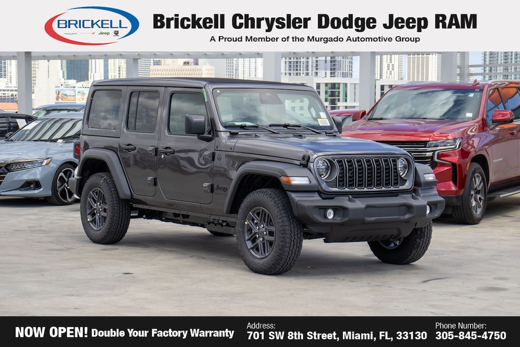 Price includes: $1000 - 2026 National Retail Bonus Cash . Exp. 03/31/2026 $1000 - 2026 National Stellantis Loyalty Bonus Cash . Exp. 03/31/2026 $500 - 2026 National 2026 Military Bonus Cash . Exp. 01/04/2027 Discover Your Next Vehicle at Brickell Chrysler Dodge Jeep Ram Welcome to Brickell CDJR, where we go beyond selling cars. We double the factory powertrain warranty, giving you added peace of mind. Our dealership offers one of the largest new car inventories in the region, ensuring you find the right vehicle Prices displayed do not included our Perma-plate. Our state-of-the-art service department is the largest in the country and is open seven days a week from 7 AM to 9 PM. Visit us at 701 SW 8th St, Miami, FL 33130, or call 305-777-2800 to learn more and schedule a test drive. The displayed price includes an incentive for financing with Brickell CDJR Finance Company. Outside financing and bank drafts are not accepted. All pre-owned vehicle exports are subject to an export fee. Prices apply only to customers who live, work, or worship in Broward, Miami-Dade, Palm Beach, Monroe, Collier, Hendry, Lee, Glades, Martin, St. Lucie, Okeechobee, Manatee, Hillsborough, Osceola, or Orange County. Customers outside these counties will pay an additional $ Taxes, title, registration, and dealer fees apply. Factory MSRP: $49,730 Granite Crystal Metallic Clearcoat 2026 Jeep Wrangler Sport S 4WD 8-Speed Automatic 3.6L V6 24V VVT