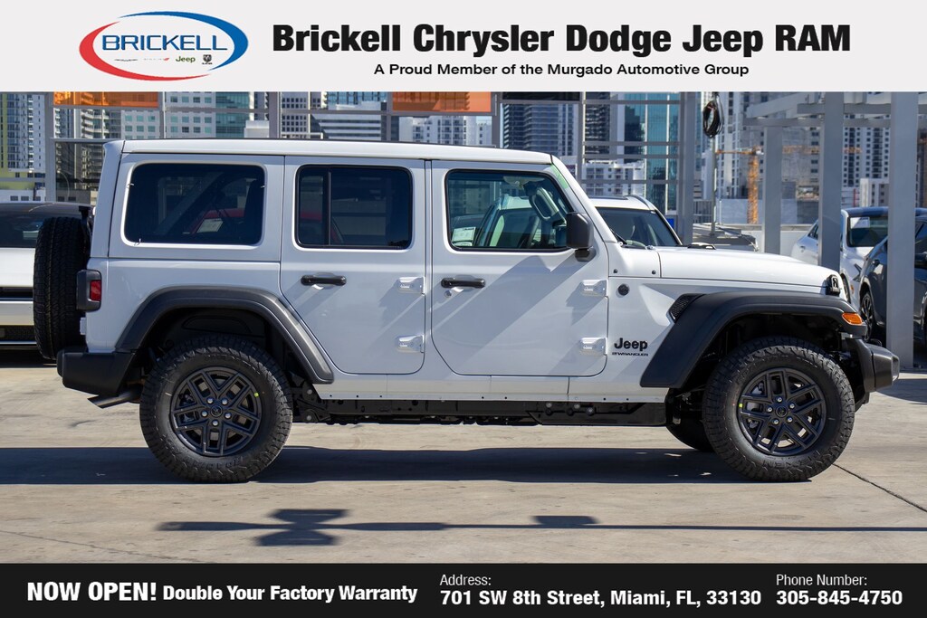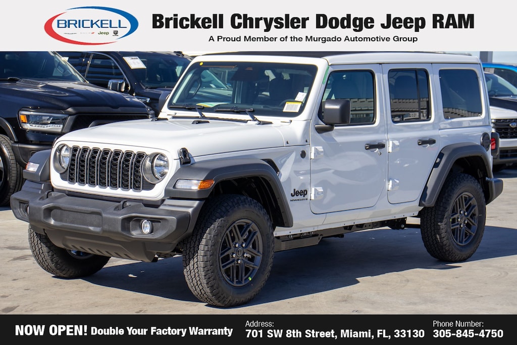 Price includes: $1500 - 2026 National Stellantis Loyalty Retail Bonus Cash . Exp. 02/02/2026 Discover Your Next Vehicle at Brickell Chrysler Dodge Jeep Ram Welcome to Brickell CDJR, where we go beyond selling cars. We double the factory powertrain warranty, giving you added peace of mind. Our dealership offers one of the largest new car inventories in the region, ensuring you find the right vehicle Prices displayed do not included our Perma-plate. Our state-of-the-art service department is the largest in the country and is open seven days a week from 7 AM to 9 PM. Visit us at 701 SW 8th St, Miami, FL 33130, or call 305-777-2800 to learn more and schedule a test drive. The displayed price includes an incentive for financing with Brickell CDJR Finance Company. Outside financing and bank drafts are not accepted. All pre-owned vehicle exports are subject to an export fee. Prices apply only to customers who live, work, or worship in Broward, Miami-Dade, Palm Beach, Monroe, Collier, Hendry, Lee, Glades, Martin, St. Lucie, Okeechobee, Manatee, Hillsborough, Osceola, or Orange County. Customers outside these counties will pay an additional $ Taxes, title, registration, and dealer fees apply. Factory MSRP: $48,140 Bright White Clearcoat 2026 Jeep Wrangler Sport S 4WD 8-Speed Automatic 3.6L V6 24V VVT