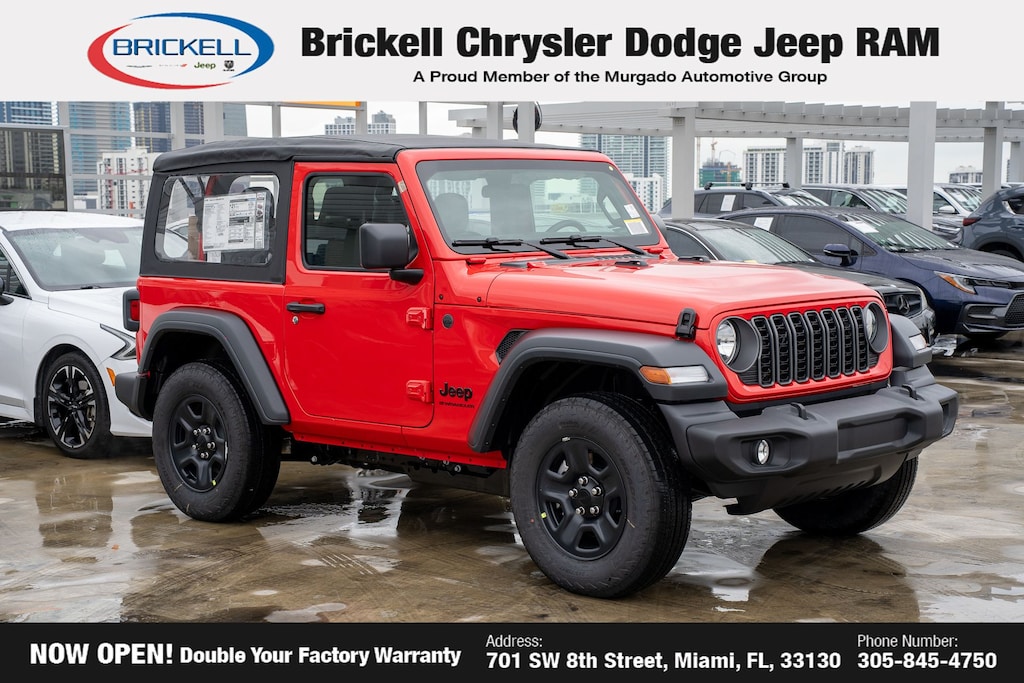 Price includes: $500 - 2026 National 2026 Military Bonus Cash . Exp. 01/04/2027 Discover Your Next Vehicle at Brickell Chrysler Dodge Jeep Ram Welcome to Brickell CDJR, where we go beyond selling cars. We double the factory powertrain warranty, giving you added peace of mind. Our dealership offers one of the largest new car inventories in the region, ensuring you find the right vehicle Prices displayed do not included our Perma-plate. Our state-of-the-art service department is the largest in the country and is open seven days a week from 7 AM to 9 PM. Visit us at 701 SW 8th St, Miami, FL 33130, or call 305-777-2800 to learn more and schedule a test drive. The displayed price includes an incentive for financing with Brickell CDJR Finance Company. Outside financing and bank drafts are not accepted. All pre-owned vehicle exports are subject to an export fee. Prices apply only to customers who live, work, or worship in Broward, Miami-Dade, Palm Beach, Monroe, Collier, Hendry, Lee, Glades, Martin, St. Lucie, Okeechobee, Manatee, Hillsborough, Osceola, or Orange County. Customers outside these counties will pay an additional $ Taxes, title, registration, and dealer fees apply. Factory MSRP: $39,390 Firecracker Red Clearcoat 2026 Jeep Wrangler Sport 4WD 8-Speed Automatic 2.0L I4 DOHC