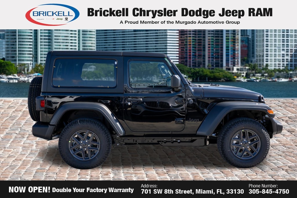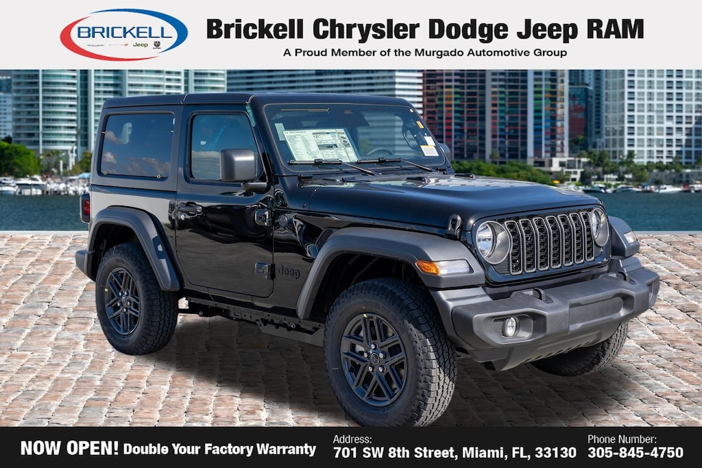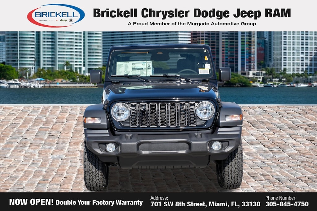Discover Your Next Vehicle at Brickell Chrysler Dodge Jeep Ram Welcome to Brickell CDJR, where we go beyond selling cars. We double the factory powertrain warranty, giving you added peace of mind. Our dealership offers one of the largest new car inventories in the region, ensuring you find the right vehicle Prices displayed do not included our Perma-plate. Our state-of-the-art service department is the largest in the country and is open seven days a week from 7 AM to 9 PM. Visit us at 701 SW 8th St, Miami, FL 33130, or call 305-777-2800 to learn more and schedule a test drive. The displayed price includes an incentive for financing with Brickell CDJR Finance Company. Outside financing and bank drafts are not accepted. All pre-owned vehicle exports are subject to an export fee. Prices apply only to customers who live, work, or worship in Broward, Miami-Dade, Palm Beach, Monroe, Collier, Hendry, Lee, Glades, Martin, St. Lucie, Okeechobee, Manatee, Hillsborough, Osceola, or Orange County. Customers outside these counties will pay an additional $ Taxes, title, registration, and dealer fees apply. Factory MSRP: $45,135 Black Clearcoat 2026 Jeep Wrangler Sport S 4WD 8-Speed Automatic 2.0L I4 DOHC