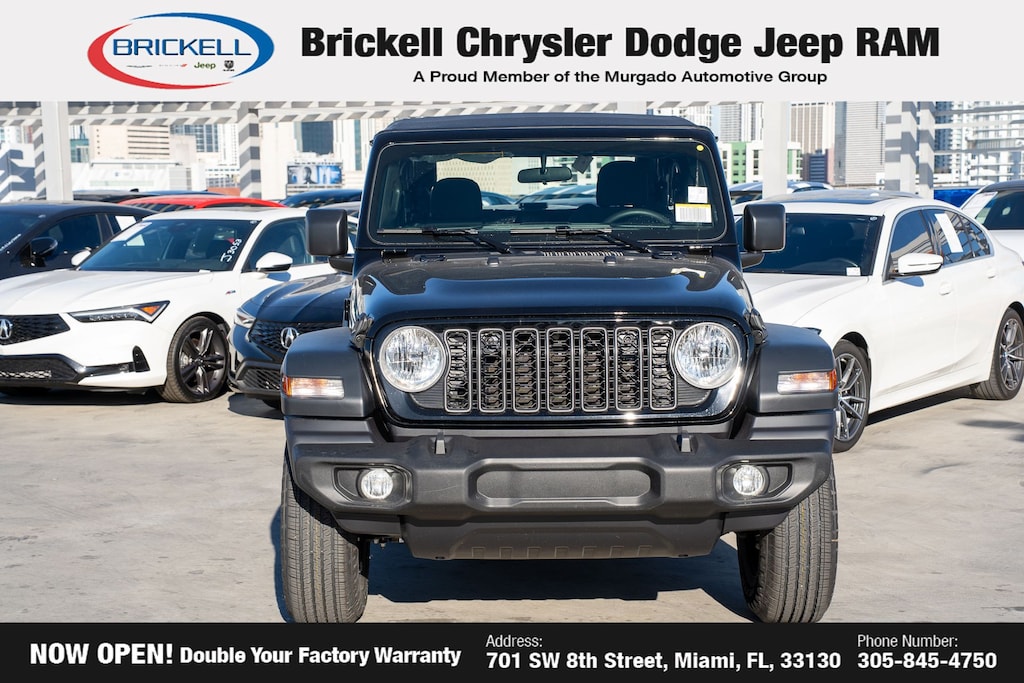 Price includes: $1500 - 2026 National Stellantis Loyalty Retail Bonus Cash . Exp. 02/02/2026 Discover Your Next Vehicle at Brickell Chrysler Dodge Jeep Ram Welcome to Brickell CDJR, where we go beyond selling cars. We double the factory powertrain warranty, giving you added peace of mind. Our dealership offers one of the largest new car inventories in the region, ensuring you find the right vehicle Prices displayed do not included our Perma-plate. Our state-of-the-art service department is the largest in the country and is open seven days a week from 7 AM to 9 PM. Visit us at 701 SW 8th St, Miami, FL 33130, or call 305-777-2800 to learn more and schedule a test drive. The displayed price includes an incentive for financing with Brickell CDJR Finance Company. Outside financing and bank drafts are not accepted. All pre-owned vehicle exports are subject to an export fee. Prices apply only to customers who live, work, or worship in Broward, Miami-Dade, Palm Beach, Monroe, Collier, Hendry, Lee, Glades, Martin, St. Lucie, Okeechobee, Manatee, Hillsborough, Osceola, or Orange County. Customers outside these counties will pay an additional $ Taxes, title, registration, and dealer fees apply. Factory MSRP: $39,985 Black Clearcoat 2026 Jeep Wrangler Sport 4WD 8-Speed Automatic 2.0L I4 DOHC
