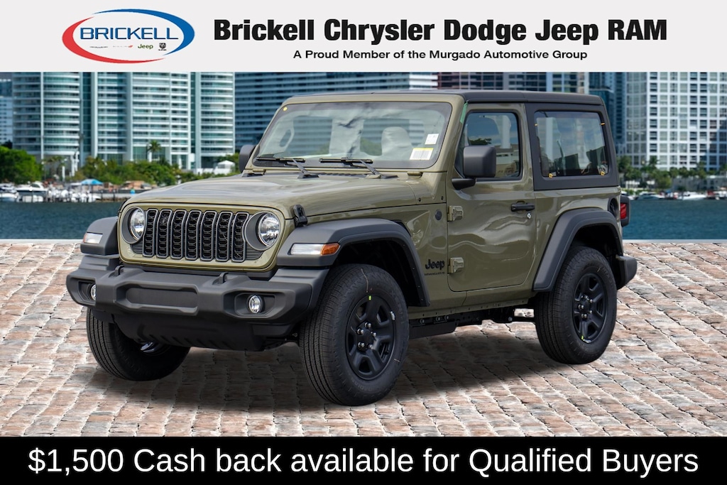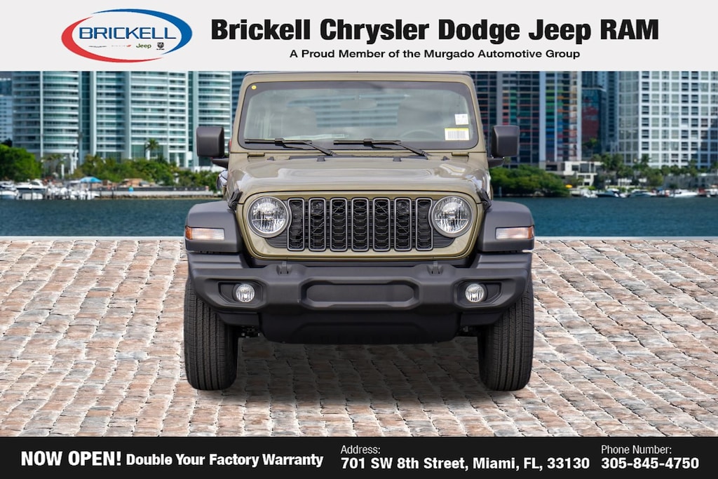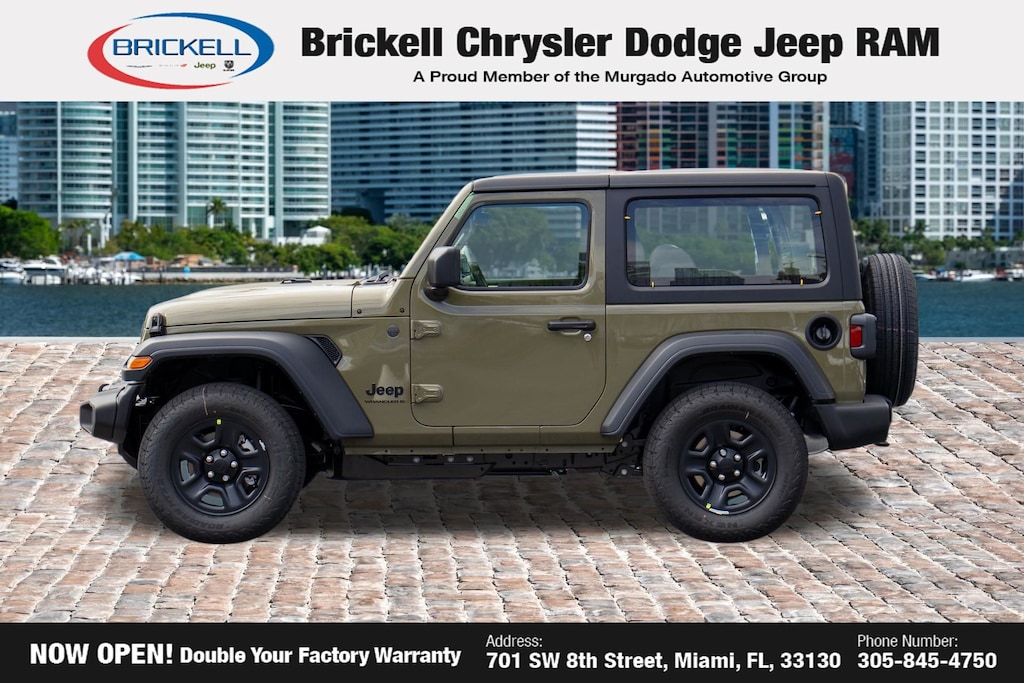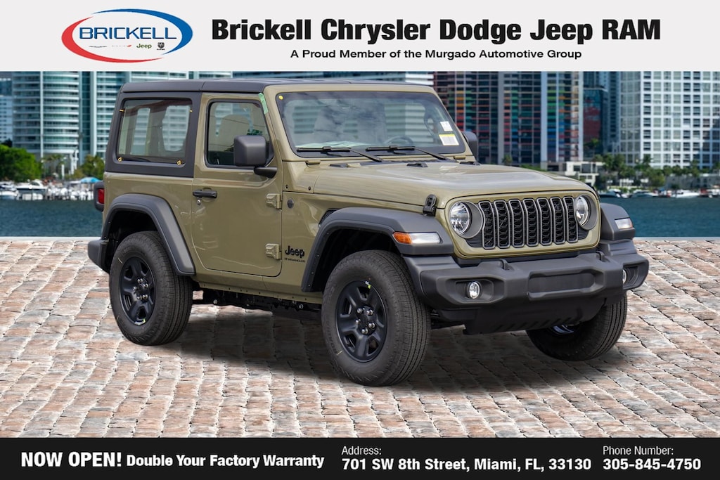 Discover Your Next Vehicle at Brickell Chrysler Dodge Jeep Ram Welcome to Brickell CDJR, where we go beyond selling cars. We double the factory powertrain warranty, giving you added peace of mind. Our dealership offers one of the largest new car inventories in the region, ensuring you find the right vehicle Prices displayed do not included our Perma-plate. Our state-of-the-art service department is the largest in the country and is open seven days a week from 7 AM to 9 PM. Visit us at 701 SW 8th St, Miami, FL 33130, or call 305-777-2800 to learn more and schedule a test drive. The displayed price includes an incentive for financing with Brickell CDJR Finance Company. Outside financing and bank drafts are not accepted. All pre-owned vehicle exports are subject to an export fee. Prices apply only to customers who live, work, or worship in Broward, Miami-Dade, Palm Beach, Monroe, Collier, Hendry, Lee, Glades, Martin, St. Lucie, Okeechobee, Manatee, Hillsborough, Osceola, or Orange County. Customers outside these counties will pay an additional $ Taxes, title, registration, and dealer fees apply. Factory MSRP: $41,880 41 2026 Jeep Wrangler Sport 4WD 8-Speed Automatic 2.0L I4 DOHC