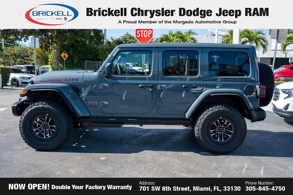 Price includes: $1500 - 2026 National Stellantis Loyalty Retail Bonus Cash . Exp. 02/02/2026 Discover Your Next Vehicle at Brickell Chrysler Dodge Jeep Ram Welcome to Brickell CDJR, where we go beyond selling cars. We double the factory powertrain warranty, giving you added peace of mind. Our dealership offers one of the largest new car inventories in the region, ensuring you find the right vehicle Prices displayed do not included our Perma-plate. Our state-of-the-art service department is the largest in the country and is open seven days a week from 7 AM to 9 PM. Visit us at 701 SW 8th St, Miami, FL 33130, or call 305-777-2800 to learn more and schedule a test drive. The displayed price includes an incentive for financing with Brickell CDJR Finance Company. Outside financing and bank drafts are not accepted. All pre-owned vehicle exports are subject to an export fee. Prices apply only to customers who live, work, or worship in Broward, Miami-Dade, Palm Beach, Monroe, Collier, Hendry, Lee, Glades, Martin, St. Lucie, Okeechobee, Manatee, Hillsborough, Osceola, or Orange County. Customers outside these counties will pay an additional $ Taxes, title, registration, and dealer fees apply. Factory MSRP: $66,675 Anvil Clear Coat 2026 Jeep Wrangler Rubicon X 4WD 8-Speed Automatic 3.6L V6 24V VVT
