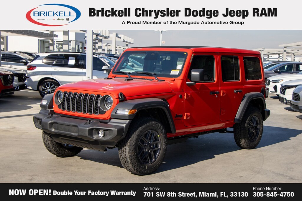 Price includes: $1500 - 2026 National Stellantis Loyalty Retail Bonus Cash . Exp. 02/02/2026 Discover Your Next Vehicle at Brickell Chrysler Dodge Jeep Ram Welcome to Brickell CDJR, where we go beyond selling cars. We double the factory powertrain warranty, giving you added peace of mind. Our dealership offers one of the largest new car inventories in the region, ensuring you find the right vehicle Prices displayed do not included our Perma-plate. Our state-of-the-art service department is the largest in the country and is open seven days a week from 7 AM to 9 PM. Visit us at 701 SW 8th St, Miami, FL 33130, or call 305-777-2800 to learn more and schedule a test drive. The displayed price includes an incentive for financing with Brickell CDJR Finance Company. Outside financing and bank drafts are not accepted. All pre-owned vehicle exports are subject to an export fee. Prices apply only to customers who live, work, or worship in Broward, Miami-Dade, Palm Beach, Monroe, Collier, Hendry, Lee, Glades, Martin, St. Lucie, Okeechobee, Manatee, Hillsborough, Osceola, or Orange County. Customers outside these counties will pay an additional $ Taxes, title, registration, and dealer fees apply. Factory MSRP: $50,685 Firecracker Red Clearcoat 2026 Jeep Wrangler Sport S 4WD 8-Speed Automatic 2.0L I4 DOHC