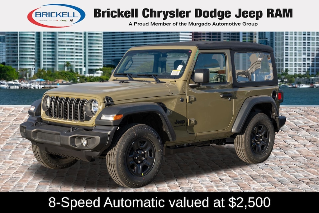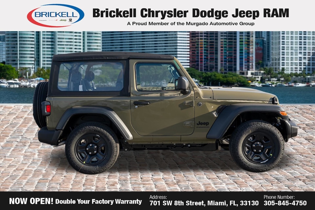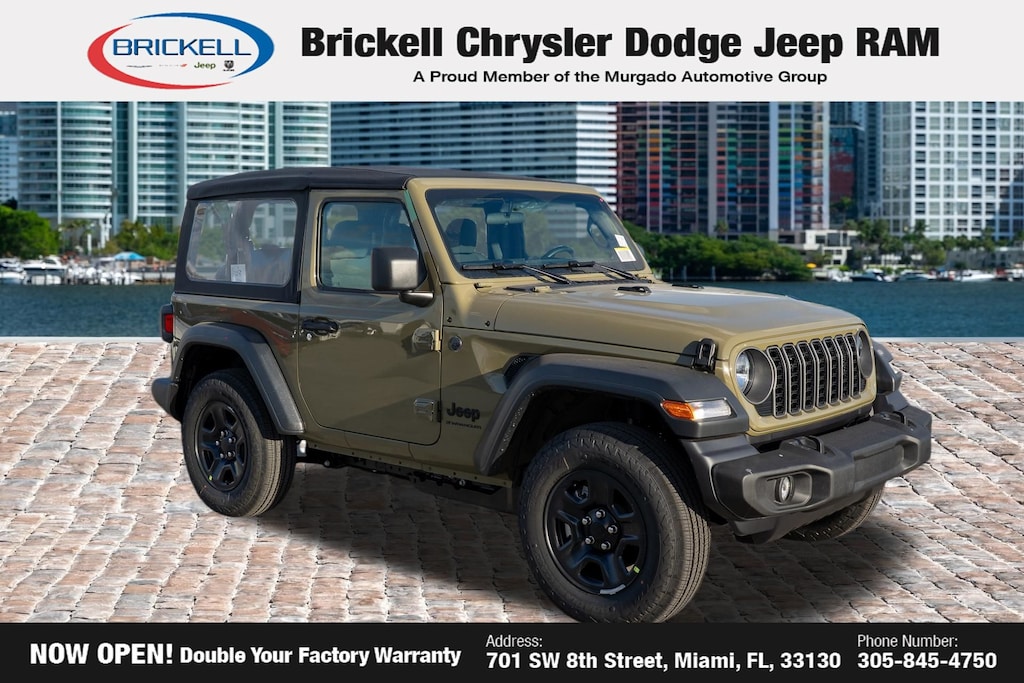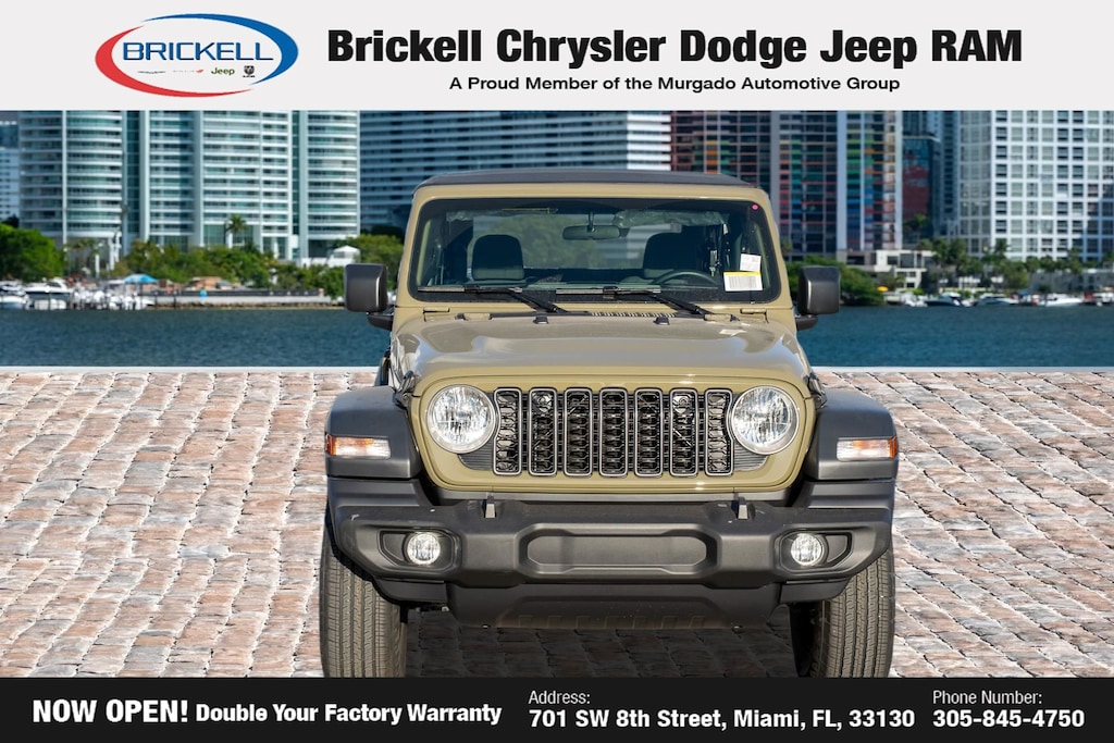 Discover Your Next Vehicle at Brickell Chrysler Dodge Jeep Ram Welcome to Brickell CDJR, where we go beyond selling cars. We double the factory powertrain warranty, giving you added peace of mind. Our dealership offers one of the largest new car inventories in the region, ensuring you find the right vehicle Prices displayed do not included our Perma-plate. Our state-of-the-art service department is the largest in the country and is open seven days a week from 7 AM to 9 PM. Visit us at 701 SW 8th St, Miami, FL 33130, or call 305-777-2800 to learn more and schedule a test drive. The displayed price includes an incentive for financing with Brickell CDJR Finance Company. Outside financing and bank drafts are not accepted. All pre-owned vehicle exports are subject to an export fee. Prices apply only to customers who live, work, or worship in Broward, Miami-Dade, Palm Beach, Monroe, Collier, Hendry, Lee, Glades, Martin, St. Lucie, Okeechobee, Manatee, Hillsborough, Osceola, or Orange County. Customers outside these counties will pay an additional $ Taxes, title, registration, and dealer fees apply. Factory MSRP: $39,985 41 2026 Jeep Wrangler Sport 4WD 8-Speed Automatic 2.0L I4 DOHC