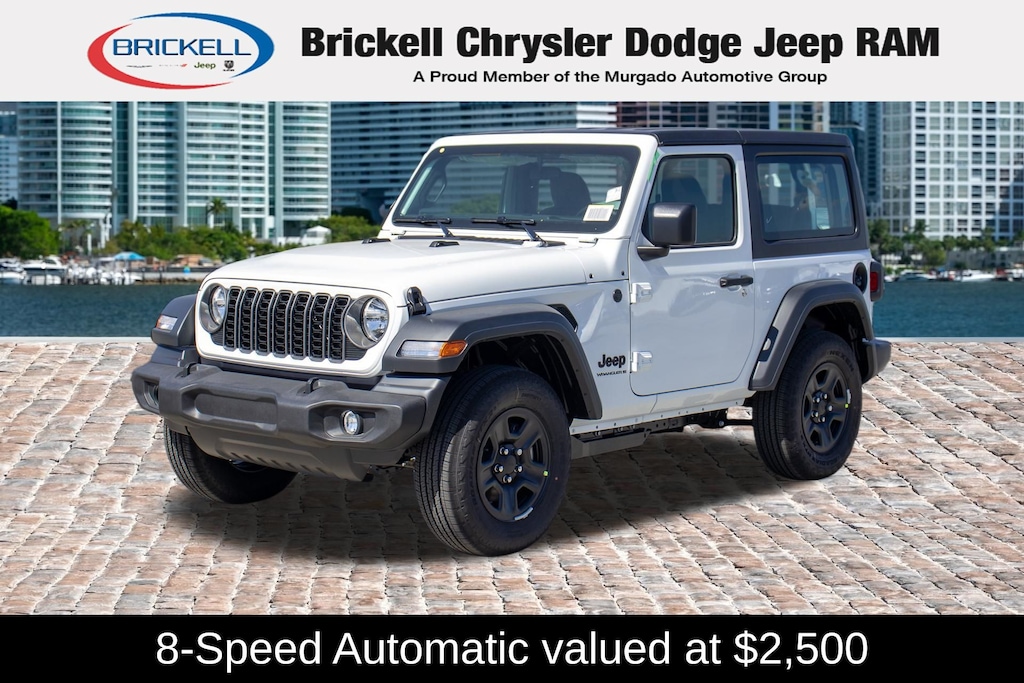 Discover Your Next Vehicle at Brickell Chrysler Dodge Jeep Ram Welcome to Brickell CDJR, where we go beyond selling cars. We double the factory powertrain warranty, giving you added peace of mind. Our dealership offers one of the largest new car inventories in the region, ensuring you find the right vehicle Prices displayed do not included our Perma-plate. Our state-of-the-art service department is the largest in the country and is open seven days a week from 7 AM to 9 PM. Visit us at 701 SW 8th St, Miami, FL 33130, or call 305-777-2800 to learn more and schedule a test drive. The displayed price includes an incentive for financing with Brickell CDJR Finance Company. Outside financing and bank drafts are not accepted. All pre-owned vehicle exports are subject to an export fee. Prices apply only to customers who live, work, or worship in Broward, Miami-Dade, Palm Beach, Monroe, Collier, Hendry, Lee, Glades, Martin, St. Lucie, Okeechobee, Manatee, Hillsborough, Osceola, or Orange County. Customers outside these counties will pay an additional $ Taxes, title, registration, and dealer fees apply. Factory MSRP: $41,285 Bright White Clearcoat 2026 Jeep Wrangler Sport 4WD 8-Speed Automatic 2.0L I4 DOHC