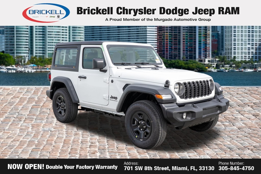 Discover Your Next Vehicle at Brickell Chrysler Dodge Jeep Ram Welcome to Brickell CDJR, where we go beyond selling cars. We double the factory powertrain warranty, giving you added peace of mind. Our dealership offers one of the largest new car inventories in the region, ensuring you find the right vehicle Prices displayed do not included our Perma-plate. Our state-of-the-art service department is the largest in the country and is open seven days a week from 7 AM to 9 PM. Visit us at 701 SW 8th St, Miami, FL 33130, or call 305-777-2800 to learn more and schedule a test drive. The displayed price includes an incentive for financing with Brickell CDJR Finance Company. Outside financing and bank drafts are not accepted. All pre-owned vehicle exports are subject to an export fee. Prices apply only to customers who live, work, or worship in Broward, Miami-Dade, Palm Beach, Monroe, Collier, Hendry, Lee, Glades, Martin, St. Lucie, Okeechobee, Manatee, Hillsborough, Osceola, or Orange County. Customers outside these counties will pay an additional $ Taxes, title, registration, and dealer fees apply. Factory MSRP: $41,285 Bright White Clearcoat 2026 Jeep Wrangler Sport 4WD 8-Speed Automatic 2.0L I4 DOHC