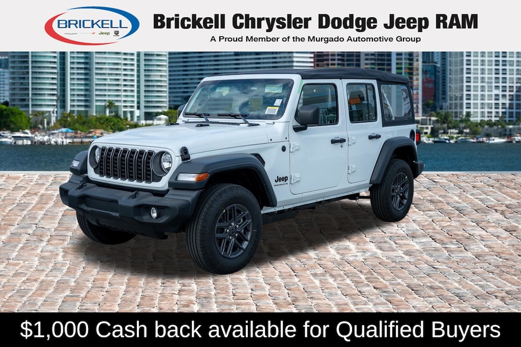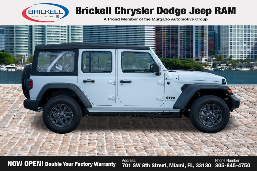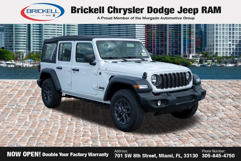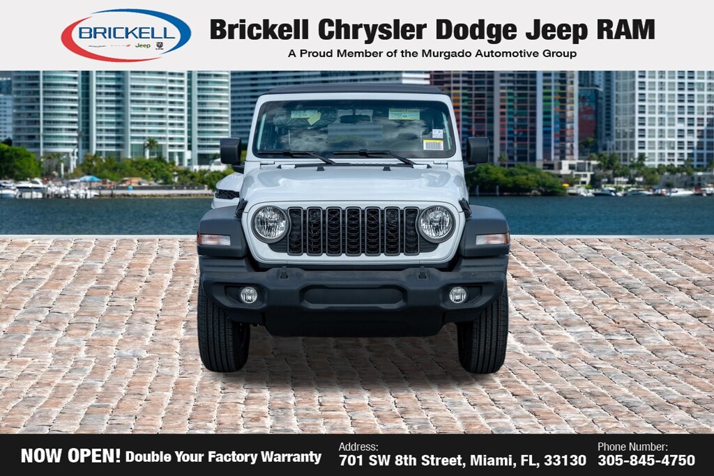 Price includes: $1000 - 2026 National Retail Bonus Cash . Exp. 04/30/2026 Discover Your Next Vehicle at Brickell Chrysler Dodge Jeep Ram Welcome to Brickell CDJR, where we go beyond selling cars. We double the factory powertrain warranty, giving you added peace of mind. Our dealership offers one of the largest new car inventories in the region, ensuring you find the right vehicle Prices displayed do not included our Perma-plate. Our state-of-the-art service department is the largest in the country and is open seven days a week from 7 AM to 9 PM. Visit us at 701 SW 8th St, Miami, FL 33130, or call 305-777-2800 to learn more and schedule a test drive. The displayed price includes an incentive for financing with Brickell CDJR Finance Company. Outside financing and bank drafts are not accepted. All pre-owned vehicle exports are subject to an export fee. Prices apply only to customers who live, work, or worship in Broward, Miami-Dade, Palm Beach, Monroe, Collier, Hendry, Lee, Glades, Martin, St. Lucie, Okeechobee, Manatee, Hillsborough, Osceola, or Orange County. Customers outside these counties will pay an additional $ Taxes, title, registration, and dealer fees apply. Factory MSRP: $42,790 bright white clearcoat 2026 Jeep Wrangler Sport 4WD 8-Speed Automatic 2.0L I4 DOHC