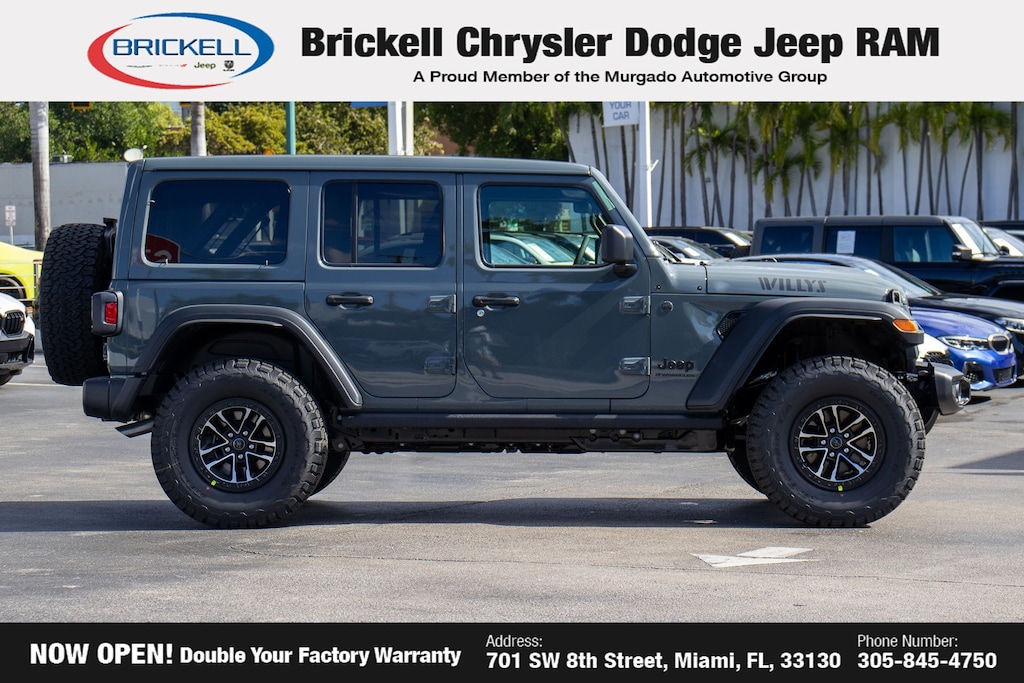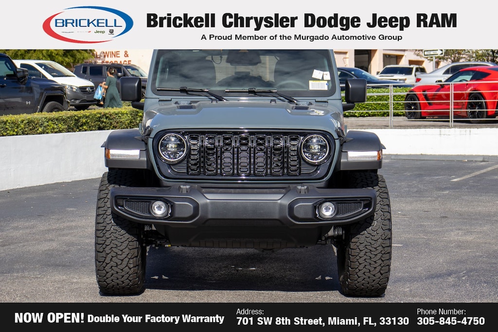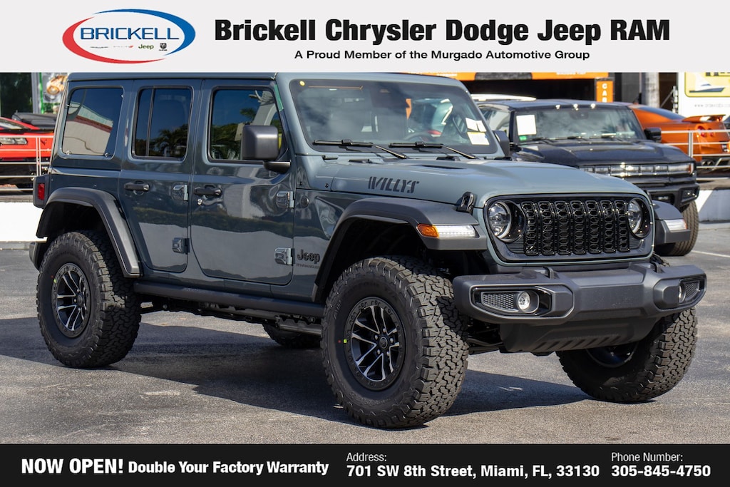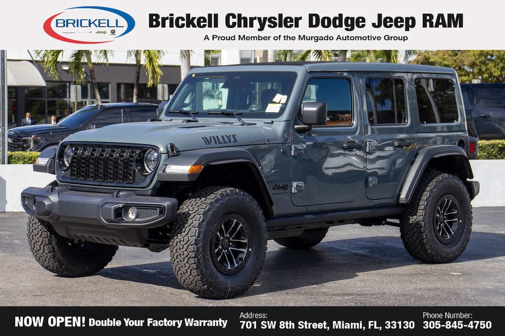 Price includes: $1500 - 2026 National Stellantis Loyalty Retail Bonus Cash . Exp. 02/02/2026 Discover Your Next Vehicle at Brickell Chrysler Dodge Jeep Ram Welcome to Brickell CDJR, where we go beyond selling cars. We double the factory powertrain warranty, giving you added peace of mind. Our dealership offers one of the largest new car inventories in the region, ensuring you find the right vehicle Prices displayed do not included our Perma-plate. Our state-of-the-art service department is the largest in the country and is open seven days a week from 7 AM to 9 PM. Visit us at 701 SW 8th St, Miami, FL 33130, or call 305-777-2800 to learn more and schedule a test drive. The displayed price includes an incentive for financing with Brickell CDJR Finance Company. Outside financing and bank drafts are not accepted. All pre-owned vehicle exports are subject to an export fee. Prices apply only to customers who live, work, or worship in Broward, Miami-Dade, Palm Beach, Monroe, Collier, Hendry, Lee, Glades, Martin, St. Lucie, Okeechobee, Manatee, Hillsborough, Osceola, or Orange County. Customers outside these counties will pay an additional $ Taxes, title, registration, and dealer fees apply. Factory MSRP: $56,080 Anvil Clear Coat 2026 Jeep Wrangler Willys 4WD 8-Speed Automatic 3.6L V6 24V VVT
