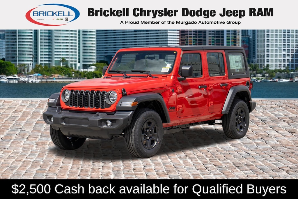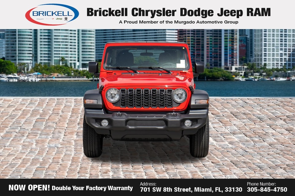 Price includes: $1000 - 2026 National Retail Bonus Cash . Exp. 04/30/2026 Discover Your Next Vehicle at Brickell Chrysler Dodge Jeep Ram Welcome to Brickell CDJR, where we go beyond selling cars. We double the factory powertrain warranty, giving you added peace of mind. Our dealership offers one of the largest new car inventories in the region, ensuring you find the right vehicle Prices displayed do not included our Perma-plate. Our state-of-the-art service department is the largest in the country and is open seven days a week from 7 AM to 9 PM. Visit us at 701 SW 8th St, Miami, FL 33130, or call 305-777-2800 to learn more and schedule a test drive. The displayed price includes an incentive for financing with Brickell CDJR Finance Company. Outside financing and bank drafts are not accepted. All pre-owned vehicle exports are subject to an export fee. Prices apply only to customers who live, work, or worship in Broward, Miami-Dade, Palm Beach, Monroe, Collier, Hendry, Lee, Glades, Martin, St. Lucie, Okeechobee, Manatee, Hillsborough, Osceola, or Orange County. Customers outside these counties will pay an additional $ Taxes, title, registration, and dealer fees apply. Factory MSRP: $45,490 Firecracker Red Clearcoat 2026 Jeep Wrangler Sport 4WD 8-Speed Automatic 3.6L V6 24V VVT