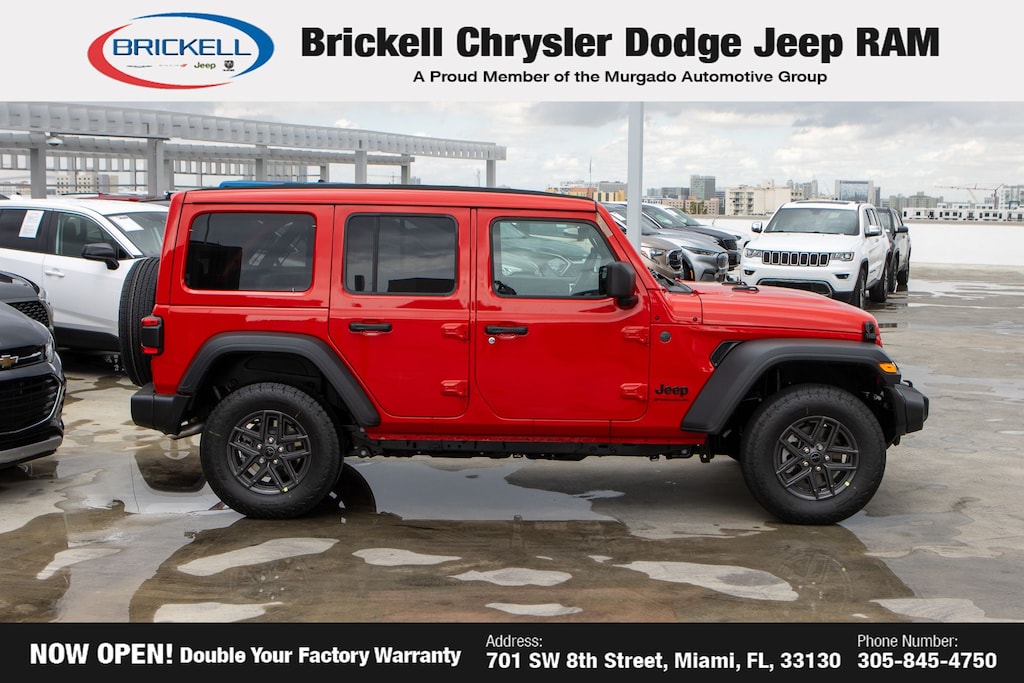 Price includes: $1500 - 2026 National Retail Bonus Cash . Exp. 12/01/2025 Discover Your Next Vehicle at Brickell Chrysler Dodge Jeep Ram Welcome to Brickell CDJR, where we go beyond selling cars. We double the factory powertrain warranty, giving you added peace of mind. Our dealership offers one of the largest new car inventories in the region, ensuring you find the right vehicle Prices displayed do not included our Perma-plate. Our state-of-the-art service department is the largest in the country and is open seven days a week from 7 AM to 9 PM. Visit us at 701 SW 8th St, Miami, FL 33130, or call 305-777-2800 to learn more and schedule a test drive. The displayed price includes an incentive for financing with Brickell CDJR Finance Company. Outside financing and bank drafts are not accepted. All pre-owned vehicle exports are subject to an export fee. Prices apply only to customers who live, work, or worship in Broward, Miami-Dade, Palm Beach, Monroe, Collier, Hendry, Lee, Glades, Martin, St. Lucie, Okeechobee, Manatee, Hillsborough, Osceola, or Orange County. Customers outside these counties will pay an additional $ Taxes, title, registration, and dealer fees apply. Factory MSRP: $54,215 Firecracker Red Clearcoat 2026 Jeep Wrangler Sport S 4WD 8-Speed Automatic 2.0L I4 DOHC