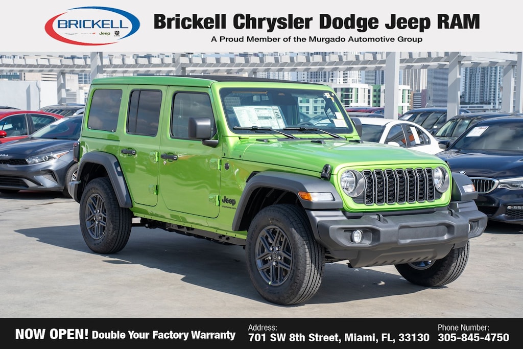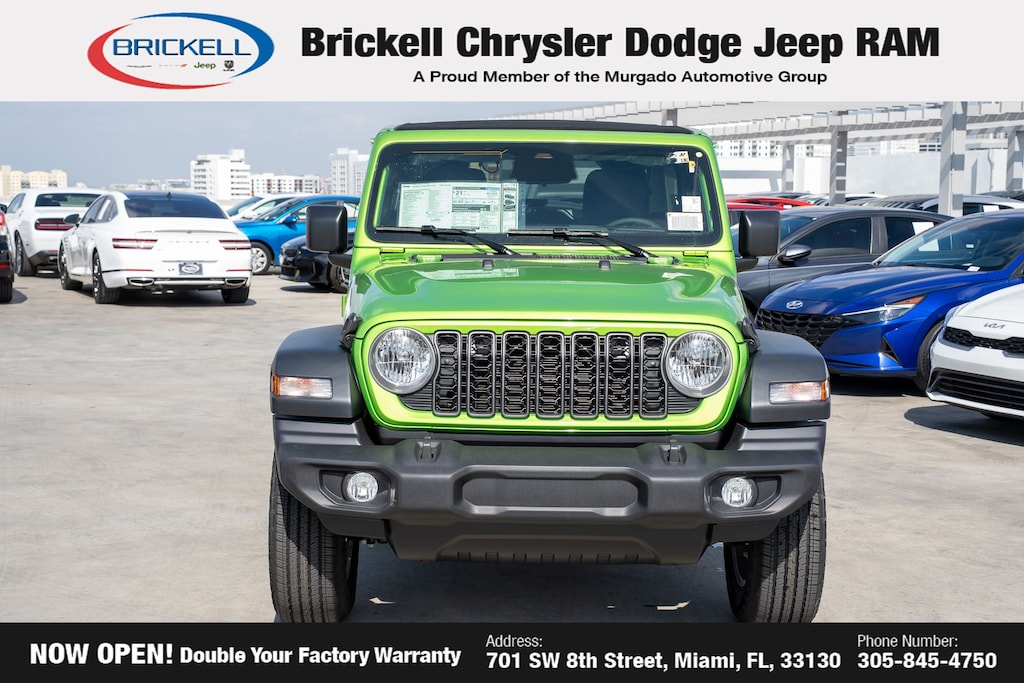 Price includes: $1500 - 2026 National Stellantis Loyalty Retail Bonus Cash . Exp. 01/05/2026 $2000 - 2026 National Select Inventory Bonus Cash. Exp. 01/05/2026 $500 - 2026 National 2026 Military Bonus Cash . Exp. 01/05/2026 $1,500 - Exp. 12/30/2025 Discover Your Next Vehicle at Brickell Chrysler Dodge Jeep Ram Welcome to Brickell CDJR, where we go beyond selling cars. We double the factory powertrain warranty, giving you added peace of mind. Our dealership offers one of the largest new car inventories in the region, ensuring you find the right vehicle Prices displayed do not included our Perma-plate. Our state-of-the-art service department is the largest in the country and is open seven days a week from 7 AM to 9 PM. Visit us at 701 SW 8th St, Miami, FL 33130, or call 305-777-2800 to learn more and schedule a test drive. The displayed price includes an incentive for financing with Brickell CDJR Finance Company. Outside financing and bank drafts are not accepted. All pre-owned vehicle exports are subject to an export fee. Prices apply only to customers who live, work, or worship in Broward, Miami-Dade, Palm Beach, Monroe, Collier, Hendry, Lee, Glades, Martin, St. Lucie, Okeechobee, Manatee, Hillsborough, Osceola, or Orange County. Customers outside these counties will pay an additional $ Taxes, title, registration, and dealer fees apply. Factory MSRP: $54,825 mojito clearcoat 2026 Jeep Wrangler Sport S 4WD 8-Speed Automatic 2.0L I4 DOHC