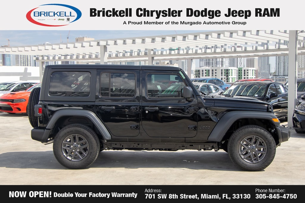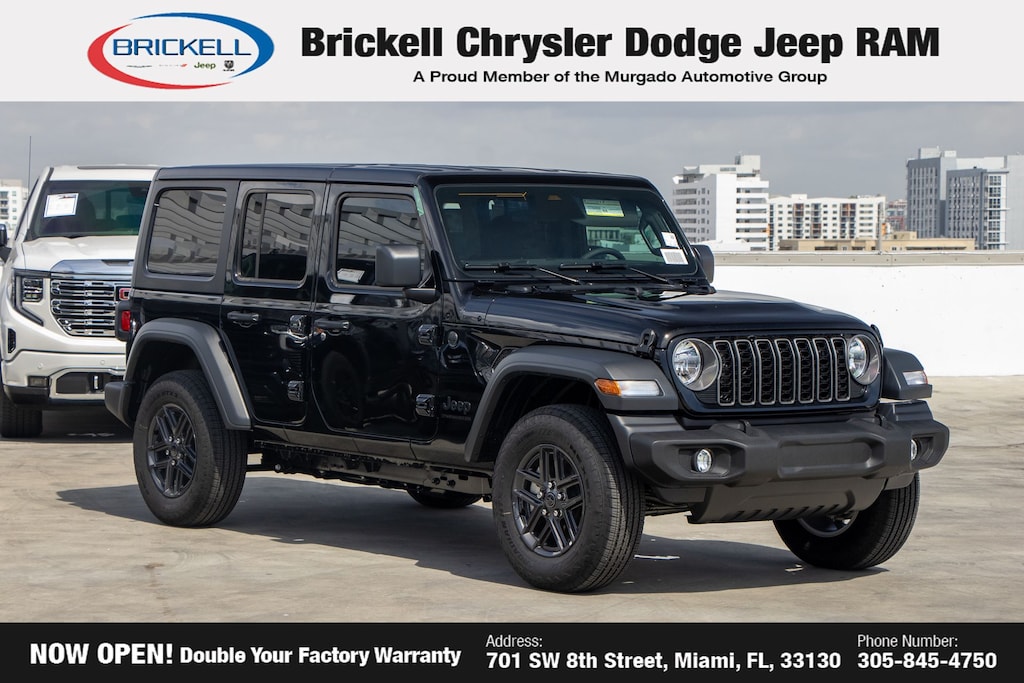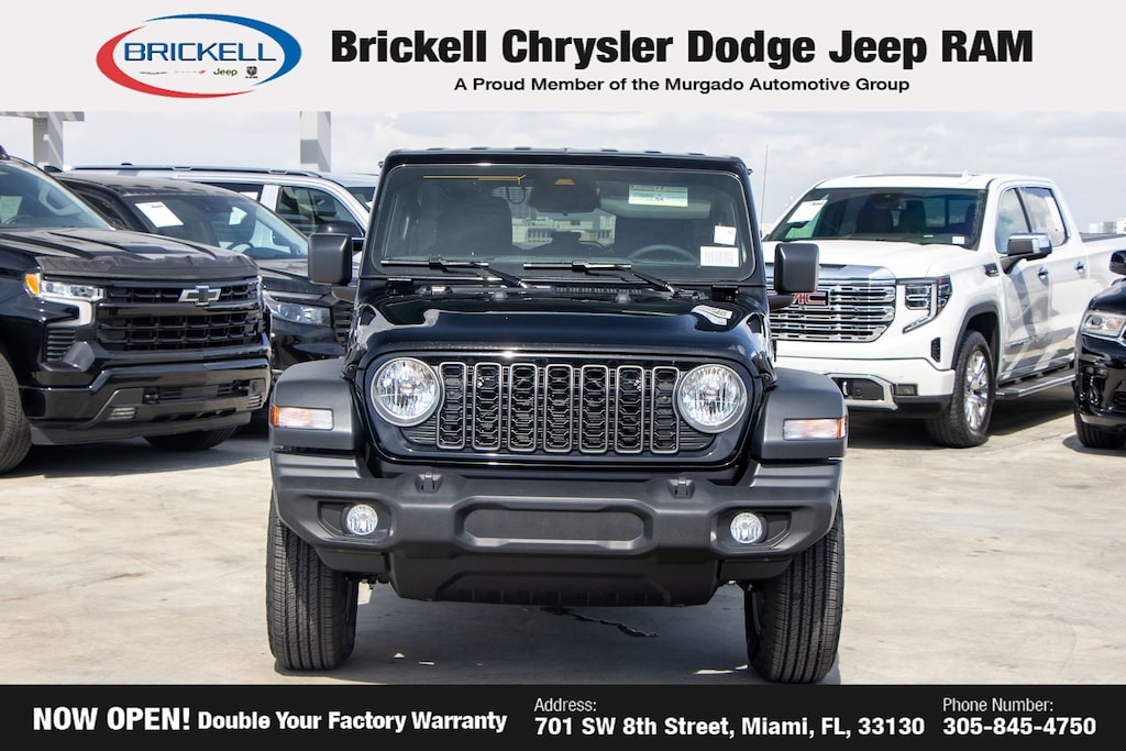 Price includes: $1500 - 2026 National Select Inventory Bonus Cash . Exp. 01/04/2027 $500 - 2026 National 2026 Military Bonus Cash . Exp. 01/04/2027 Discover Your Next Vehicle at Brickell Chrysler Dodge Jeep Ram Welcome to Brickell CDJR, where we go beyond selling cars. We double the factory powertrain warranty, giving you added peace of mind. Our dealership offers one of the largest new car inventories in the region, ensuring you find the right vehicle Prices displayed do not included our Perma-plate. Our state-of-the-art service department is the largest in the country and is open seven days a week from 7 AM to 9 PM. Visit us at 701 SW 8th St, Miami, FL 33130, or call 305-777-2800 to learn more and schedule a test drive. The displayed price includes an incentive for financing with Brickell CDJR Finance Company. Outside financing and bank drafts are not accepted. All pre-owned vehicle exports are subject to an export fee. Prices apply only to customers who live, work, or worship in Broward, Miami-Dade, Palm Beach, Monroe, Collier, Hendry, Lee, Glades, Martin, St. Lucie, Okeechobee, Manatee, Hillsborough, Osceola, or Orange County. Customers outside these counties will pay an additional $ Taxes, title, registration, and dealer fees apply. Black Clearcoat 2026 Jeep Wrangler Sport S 4WD 8-Speed Automatic 2.0L I4 DOHC