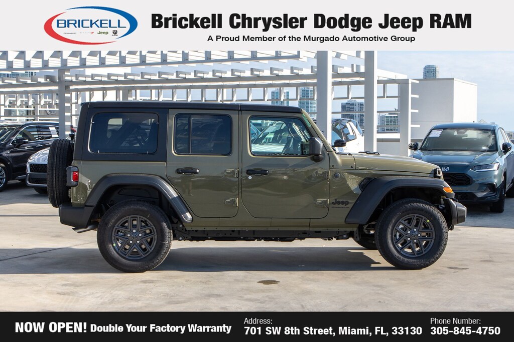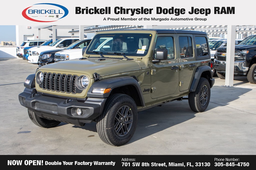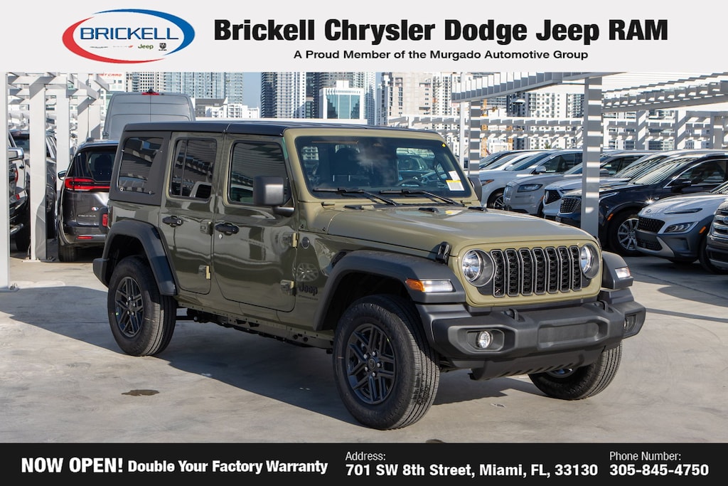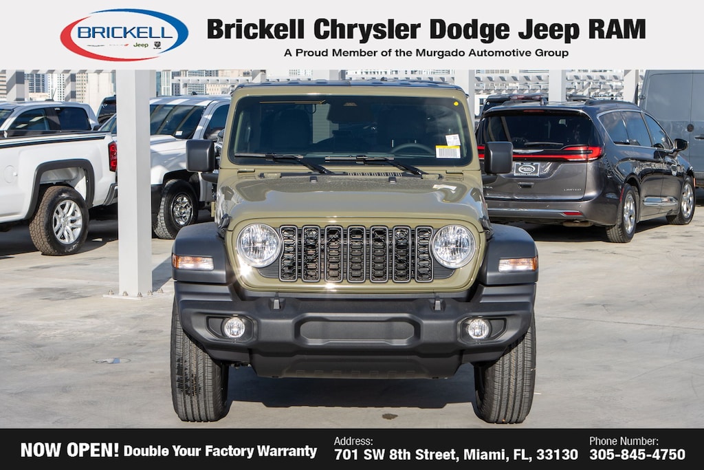 Price includes: $1500 - 2026 National Retail Bonus Cash . Exp. 12/01/2025 Discover Your Next Vehicle at Brickell Chrysler Dodge Jeep Ram Welcome to Brickell CDJR, where we go beyond selling cars. We double the factory powertrain warranty, giving you added peace of mind. Our dealership offers one of the largest new car inventories in the region, ensuring you find the right vehicle Prices displayed do not included our Perma-plate. Our state-of-the-art service department is the largest in the country and is open seven days a week from 7 AM to 9 PM. Visit us at 701 SW 8th St, Miami, FL 33130, or call 305-777-2800 to learn more and schedule a test drive. The displayed price includes an incentive for financing with Brickell CDJR Finance Company. Outside financing and bank drafts are not accepted. All pre-owned vehicle exports are subject to an export fee. Prices apply only to customers who live, work, or worship in Broward, Miami-Dade, Palm Beach, Monroe, Collier, Hendry, Lee, Glades, Martin, St. Lucie, Okeechobee, Manatee, Hillsborough, Osceola, or Orange County. Customers outside these counties will pay an additional $ Taxes, title, registration, and dealer fees apply. Factory MSRP: $48,835 Pj5 2026 Jeep Wrangler Sport S 4WD 8-Speed Automatic 2.0L I4 DOHC
