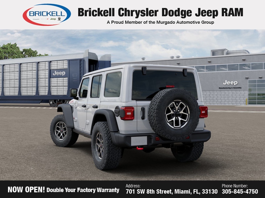 Discover Your Next Vehicle at Brickell Chrysler Dodge Jeep Ram Welcome to Brickell CDJR, where we go beyond selling cars. We double the factory powertrain warranty, giving you added peace of mind. Our dealership offers one of the largest new car inventories in the region, ensuring you find the right vehicle Prices displayed do not included our Perma-plate. Our state-of-the-art service department is the largest in the country and is open seven days a week from 7 AM to 9 PM. Visit us at 701 SW 8th St, Miami, FL 33130, or call 305-777-2800 to learn more and schedule a test drive. The displayed price includes an incentive for financing with Brickell CDJR Finance Company. Outside financing and bank drafts are not accepted. All pre-owned vehicle exports are subject to an export fee. Prices apply only to customers who live, work, or worship in Broward, Miami-Dade, Palm Beach, Monroe, Collier, Hendry, Lee, Glades, Martin, St. Lucie, Okeechobee, Manatee, Hillsborough, Osceola, or Orange County. Customers outside these counties will pay an additional $ Taxes, title, registration, and dealer fees apply. Factory MSRP: $56,485 Bright White Clearcoat 2026 Jeep Wrangler Rubicon 4WD 8-Speed Automatic 2.0L I4 DOHC