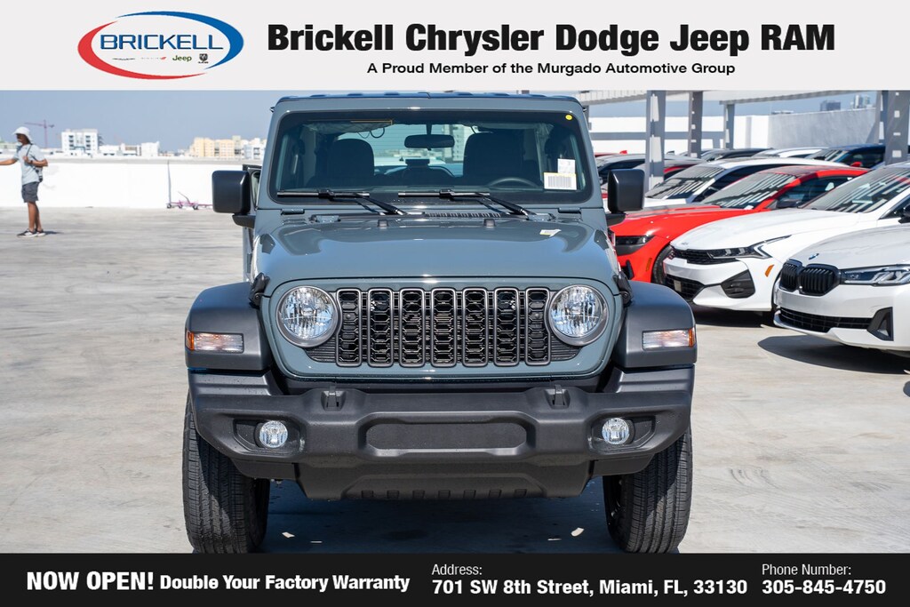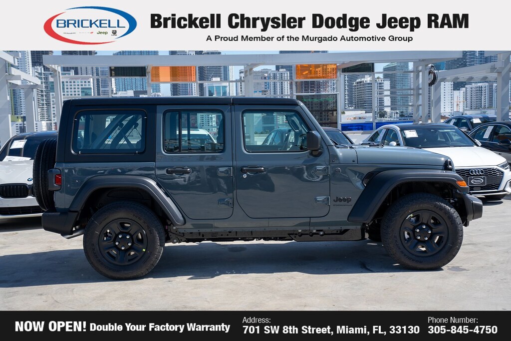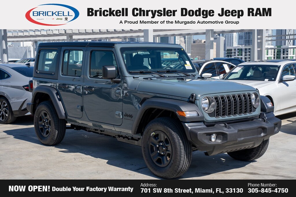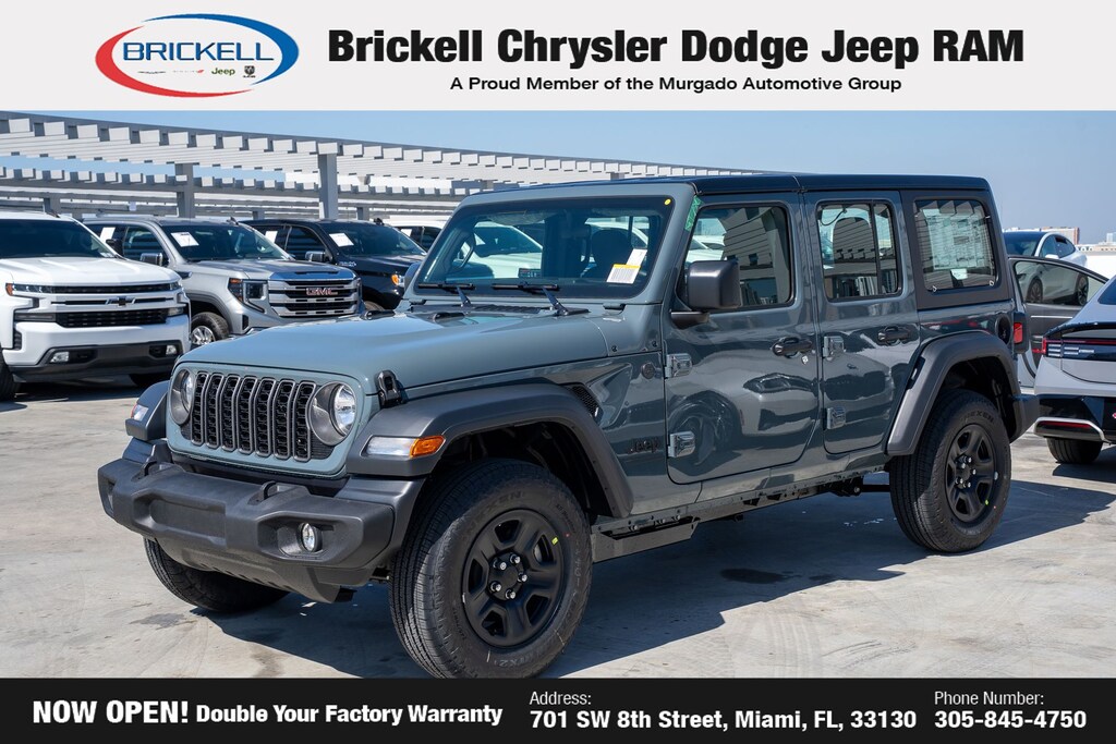 Price includes: $500 - 2026 National 2026 Military Bonus Cash . Exp. 01/04/2027 Discover Your Next Vehicle at Brickell Chrysler Dodge Jeep Ram Welcome to Brickell CDJR, where we go beyond selling cars. We double the factory powertrain warranty, giving you added peace of mind. Our dealership offers one of the largest new car inventories in the region, ensuring you find the right vehicle Prices displayed do not included our Perma-plate. Our state-of-the-art service department is the largest in the country and is open seven days a week from 7 AM to 9 PM. Visit us at 701 SW 8th St, Miami, FL 33130, or call 305-777-2800 to learn more and schedule a test drive. The displayed price includes an incentive for financing with Brickell CDJR Finance Company. Outside financing and bank drafts are not accepted. All pre-owned vehicle exports are subject to an export fee. Prices apply only to customers who live, work, or worship in Broward, Miami-Dade, Palm Beach, Monroe, Collier, Hendry, Lee, Glades, Martin, St. Lucie, Okeechobee, Manatee, Hillsborough, Osceola, or Orange County. Customers outside these counties will pay an additional $ Taxes, title, registration, and dealer fees apply. Factory MSRP: $45,085 Anvil Clear Coat 2026 Jeep Wrangler Sport 4WD 8-Speed Automatic 2.0L I4 DOHC