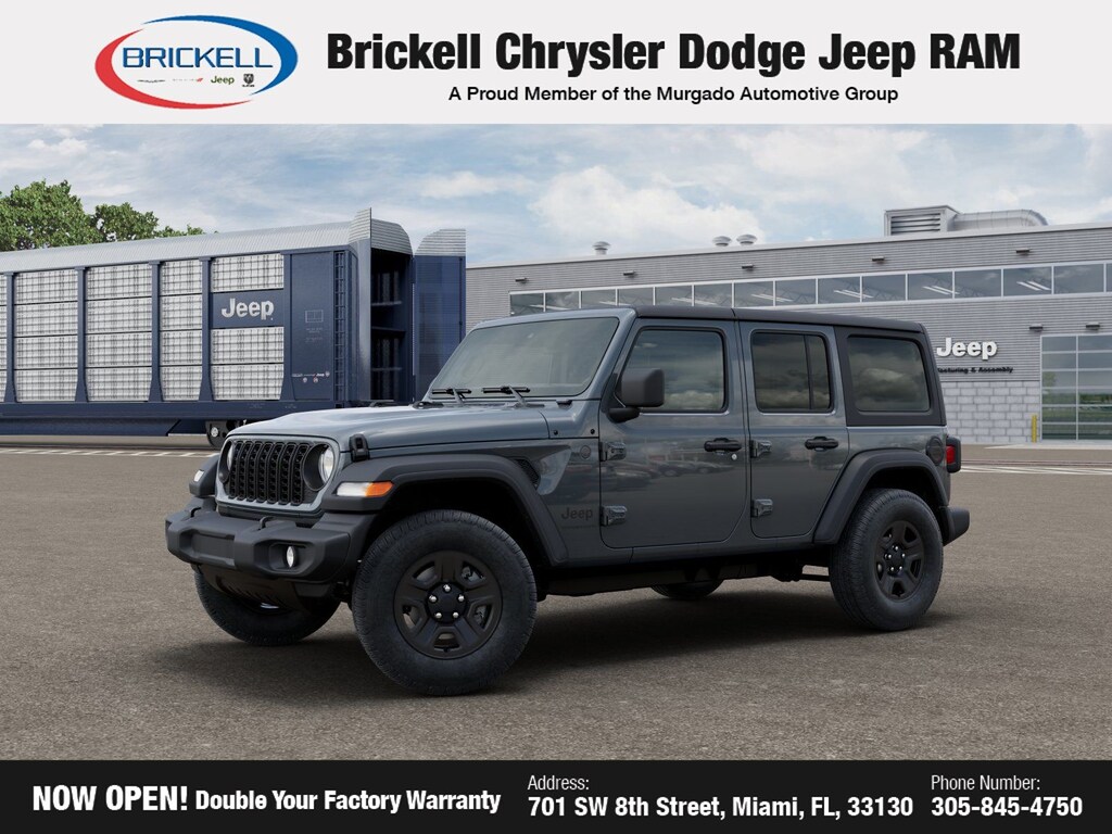 Discover Your Next Vehicle at Brickell Chrysler Dodge Jeep Ram Welcome to Brickell CDJR, where we go beyond selling cars. We double the factory powertrain warranty, giving you added peace of mind. Our dealership offers one of the largest new car inventories in the region, ensuring you find the right vehicle Prices displayed do not included our Perma-plate. Our state-of-the-art service department is the largest in the country and is open seven days a week from 7 AM to 9 PM. Visit us at 701 SW 8th St, Miami, FL 33130, or call 305-777-2800 to learn more and schedule a test drive. The displayed price includes an incentive for financing with Brickell CDJR Finance Company. Outside financing and bank drafts are not accepted. All pre-owned vehicle exports are subject to an export fee. Prices apply only to customers who live, work, or worship in Broward, Miami-Dade, Palm Beach, Monroe, Collier, Hendry, Lee, Glades, Martin, St. Lucie, Okeechobee, Manatee, Hillsborough, Osceola, or Orange County. Customers outside these counties will pay an additional $ Taxes, title, registration, and dealer fees apply. Factory MSRP: $45,230 2026 Jeep Wrangler Sport 4WD 8-Speed Automatic 2.0L I4 DOHC