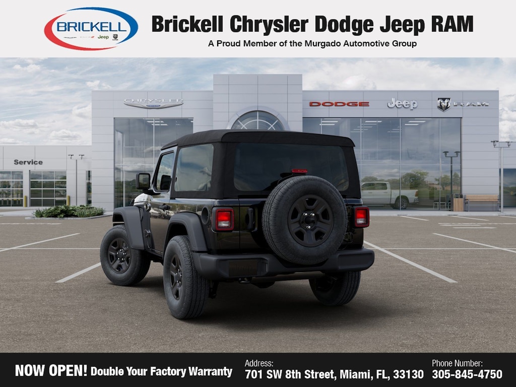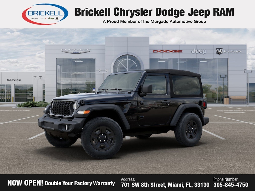 Price includes: $1000 - 2026 National Select Inventory Bonus Cash . Exp. 01/05/2026 Discover Your Next Vehicle at Brickell Chrysler Dodge Jeep Ram Welcome to Brickell CDJR, where we go beyond selling cars. We double the factory powertrain warranty, giving you added peace of mind. Our dealership offers one of the largest new car inventories in the region, ensuring you find the right vehicle Prices displayed do not included our Perma-plate. Our state-of-the-art service department is the largest in the country and is open seven days a week from 7 AM to 9 PM. Visit us at 701 SW 8th St, Miami, FL 33130, or call 305-777-2800 to learn more and schedule a test drive. The displayed price includes an incentive for financing with Brickell CDJR Finance Company. Outside financing and bank drafts are not accepted. All pre-owned vehicle exports are subject to an export fee. Prices apply only to customers who live, work, or worship in Broward, Miami-Dade, Palm Beach, Monroe, Collier, Hendry, Lee, Glades, Martin, St. Lucie, Okeechobee, Manatee, Hillsborough, Osceola, or Orange County. Customers outside these counties will pay an additional $ Taxes, title, registration, and dealer fees apply. Factory MSRP: $39,485 Black Clearcoat 2026 Jeep Wrangler Sport 4WD 8-Speed Automatic 2.0L I4 DOHC