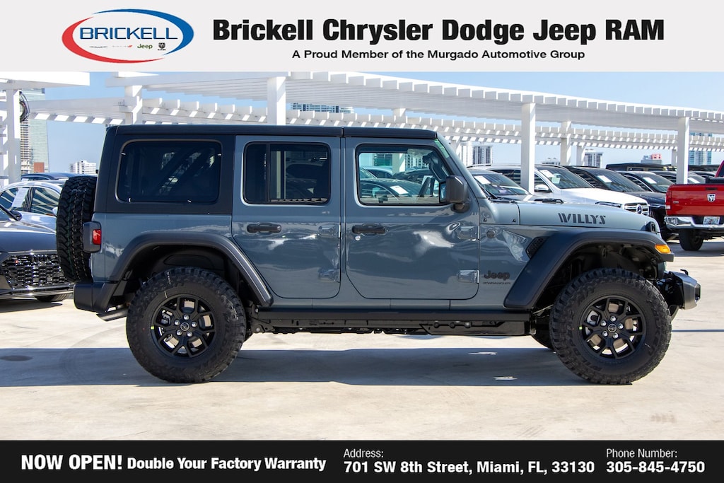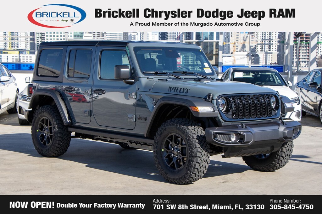 Price includes: $500 - 2026 National 2026 Military Bonus Cash . Exp. 01/04/2027 Discover Your Next Vehicle at Brickell Chrysler Dodge Jeep Ram Welcome to Brickell CDJR, where we go beyond selling cars. We double the factory powertrain warranty, giving you added peace of mind. Our dealership offers one of the largest new car inventories in the region, ensuring you find the right vehicle Prices displayed do not included our Perma-plate. Our state-of-the-art service department is the largest in the country and is open seven days a week from 7 AM to 9 PM. Visit us at 701 SW 8th St, Miami, FL 33130, or call 305-777-2800 to learn more and schedule a test drive. The displayed price includes an incentive for financing with Brickell CDJR Finance Company. Outside financing and bank drafts are not accepted. All pre-owned vehicle exports are subject to an export fee. Prices apply only to customers who live, work, or worship in Broward, Miami-Dade, Palm Beach, Monroe, Collier, Hendry, Lee, Glades, Martin, St. Lucie, Okeechobee, Manatee, Hillsborough, Osceola, or Orange County. Customers outside these counties will pay an additional $ Taxes, title, registration, and dealer fees apply. Factory MSRP: $51,485 Anvil Clear Coat 2026 Jeep Wrangler Willys 4WD 8-Speed Automatic 2.0L I4 DOHC