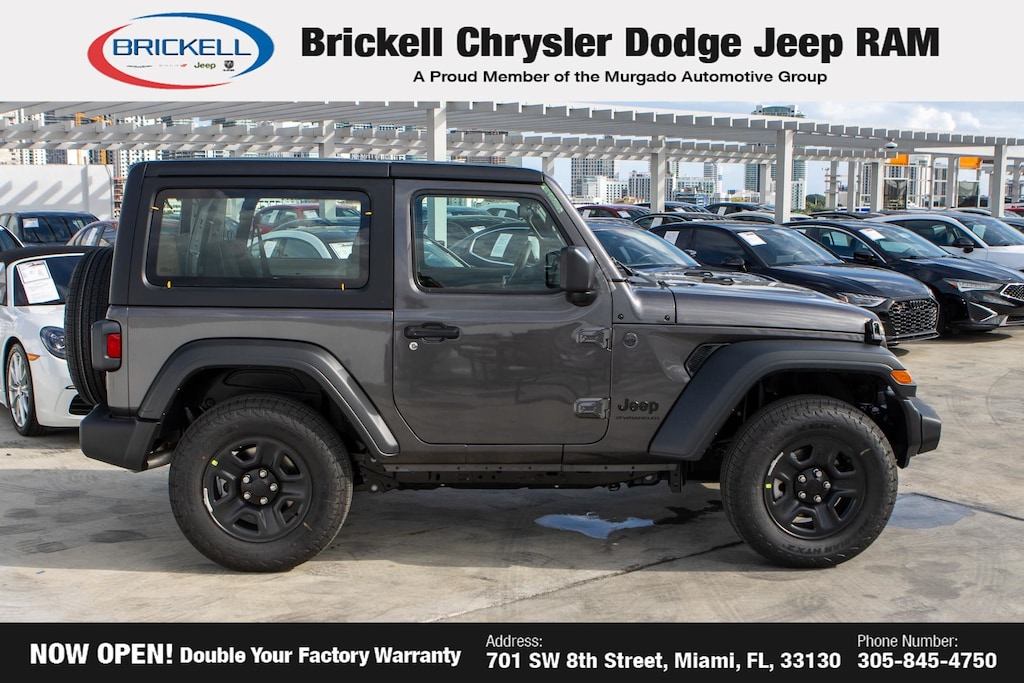 Price includes: $1000 - 2026 National Select Inventory Bonus Cash . Exp. 01/04/2027 $1500 - 2026 National Stellantis Loyalty Retail Bonus Cash . Exp. 02/02/2026 Discover Your Next Vehicle at Brickell Chrysler Dodge Jeep Ram Welcome to Brickell CDJR, where we go beyond selling cars. We double the factory powertrain warranty, giving you added peace of mind. Our dealership offers one of the largest new car inventories in the region, ensuring you find the right vehicle Prices displayed do not included our Perma-plate. Our state-of-the-art service department is the largest in the country and is open seven days a week from 7 AM to 9 PM. Visit us at 701 SW 8th St, Miami, FL 33130, or call 305-777-2800 to learn more and schedule a test drive. The displayed price includes an incentive for financing with Brickell CDJR Finance Company. Outside financing and bank drafts are not accepted. All pre-owned vehicle exports are subject to an export fee. Prices apply only to customers who live, work, or worship in Broward, Miami-Dade, Palm Beach, Monroe, Collier, Hendry, Lee, Glades, Martin, St. Lucie, Okeechobee, Manatee, Hillsborough, Osceola, or Orange County. Customers outside these counties will pay an additional $ Taxes, title, registration, and dealer fees apply. Factory MSRP: $41,380 Granite Crystal Metallic Clearcoat 2026 Jeep Wrangler Sport 4WD 8-Speed Automatic 2.0L I4 DOHC