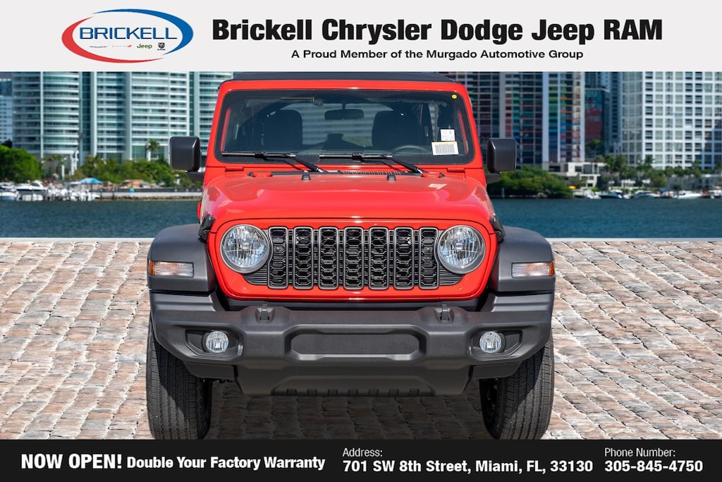 Price includes: $1000 - 2026 National Retail Bonus Cash . Exp. 04/30/2026 Discover Your Next Vehicle at Brickell Chrysler Dodge Jeep Ram Welcome to Brickell CDJR, where we go beyond selling cars. We double the factory powertrain warranty, giving you added peace of mind. Our dealership offers one of the largest new car inventories in the region, ensuring you find the right vehicle Prices displayed do not included our Perma-plate. Our state-of-the-art service department is the largest in the country and is open seven days a week from 7 AM to 9 PM. Visit us at 701 SW 8th St, Miami, FL 33130, or call 305-777-2800 to learn more and schedule a test drive. The displayed price includes an incentive for financing with Brickell CDJR Finance Company. Outside financing and bank drafts are not accepted. All pre-owned vehicle exports are subject to an export fee. Prices apply only to customers who live, work, or worship in Broward, Miami-Dade, Palm Beach, Monroe, Collier, Hendry, Lee, Glades, Martin, St. Lucie, Okeechobee, Manatee, Hillsborough, Osceola, or Orange County. Customers outside these counties will pay an additional $ Taxes, title, registration, and dealer fees apply. Factory MSRP: $42,595 Firecracker Red Clearcoat 2026 Jeep Wrangler Sport 4WD 8-Speed Automatic 2.0L I4 DOHC