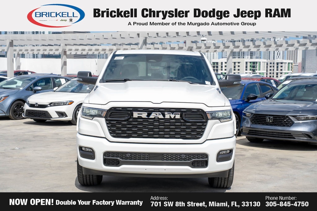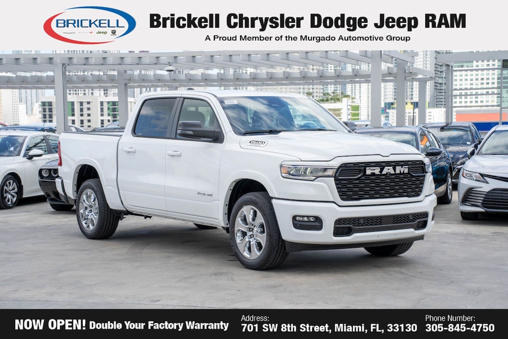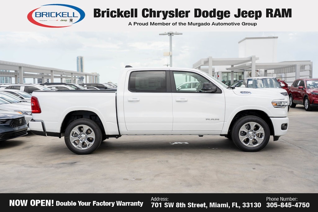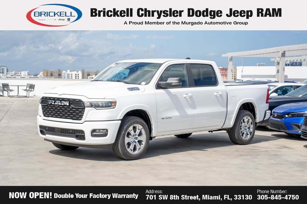 Price includes: $500 - 2025 National 2025 Military Bonus Cash. Exp. 01/05/2026 10% Msrp - 2025 National 10% Below MSRP . Exp. 12/01/2025 Discover Your Next Vehicle at Brickell Chrysler Dodge Jeep Ram Welcome to Brickell CDJR, where we go beyond selling cars. We double the factory powertrain warranty, giving you added peace of mind. Our dealership offers one of the largest new car inventories in the region, ensuring you find the right vehicle Prices displayed do not included our Perma-plate. Our state-of-the-art service department is the largest in the country and is open seven days a week from 7 AM to 9 PM. Visit us at 701 SW 8th St, Miami, FL 33130, or call 305-777-2800 to learn more and schedule a test drive. The displayed price includes an incentive for financing with Brickell CDJR Finance Company. Outside financing and bank drafts are not accepted. All pre-owned vehicle exports are subject to an export fee. Prices apply only to customers who live, work, or worship in Broward, Miami-Dade, Palm Beach, Monroe, Collier, Hendry, Lee, Glades, Martin, St. Lucie, Okeechobee, Manatee, Hillsborough, Osceola, or Orange County. Customers outside these counties will pay an additional $ Taxes, title, registration, and dealer fees apply. Factory MSRP: $60,355 Bright White Clearcoat 2025 Ram 1500 Big Horn/Lone Star 4WD 8-Speed Automatic 3.6L V6 24V VVT