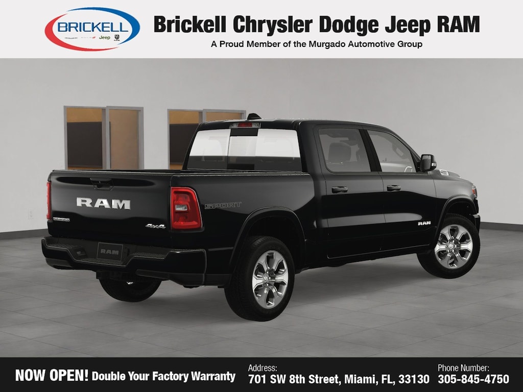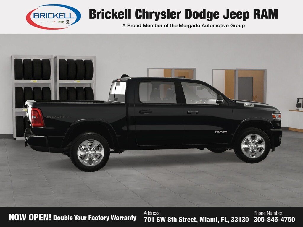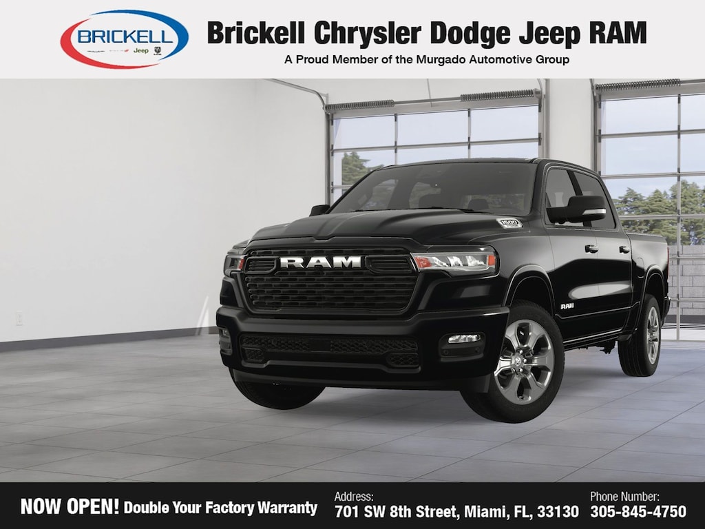 Price includes: $500 - 2025 National 2025 Military Bonus Cash. Exp. 01/05/2026 10% Msrp - 2025 National 10% Below MSRP . Exp. 11/03/2025 Discover Your Next Vehicle at Brickell Chrysler Dodge Jeep Ram Welcome to Brickell CDJR, where we go beyond selling cars. We double the factory powertrain warranty, giving you added peace of mind. Our dealership offers one of the largest new car inventories in the region, ensuring you find the right vehicle Prices displayed do not included our Perma-plate. Our state-of-the-art service department is the largest in the country and is open seven days a week from 7 AM to 9 PM. Visit us at 701 SW 8th St, Miami, FL 33130, or call 305-777-2800 to learn more and schedule a test drive. The displayed price includes an incentive for financing with Brickell CDJR Finance Company. Outside financing and bank drafts are not accepted. All pre-owned vehicle exports are subject to an export fee. Prices apply only to customers who live, work, or worship in Broward, Miami-Dade, Palm Beach, Monroe, Collier, Hendry, Lee, Glades, Martin, St. Lucie, Okeechobee, Manatee, Hillsborough, Osceola, or Orange County. Customers outside these counties will pay an additional $ Taxes, title, registration, and dealer fees apply. Factory MSRP: $60,650 Diamond Black Crystal Pearlcoat 2025 Ram 1500 Big Horn/Lone Star 4WD 8-Speed Automatic 3.6L V6 24V VVT