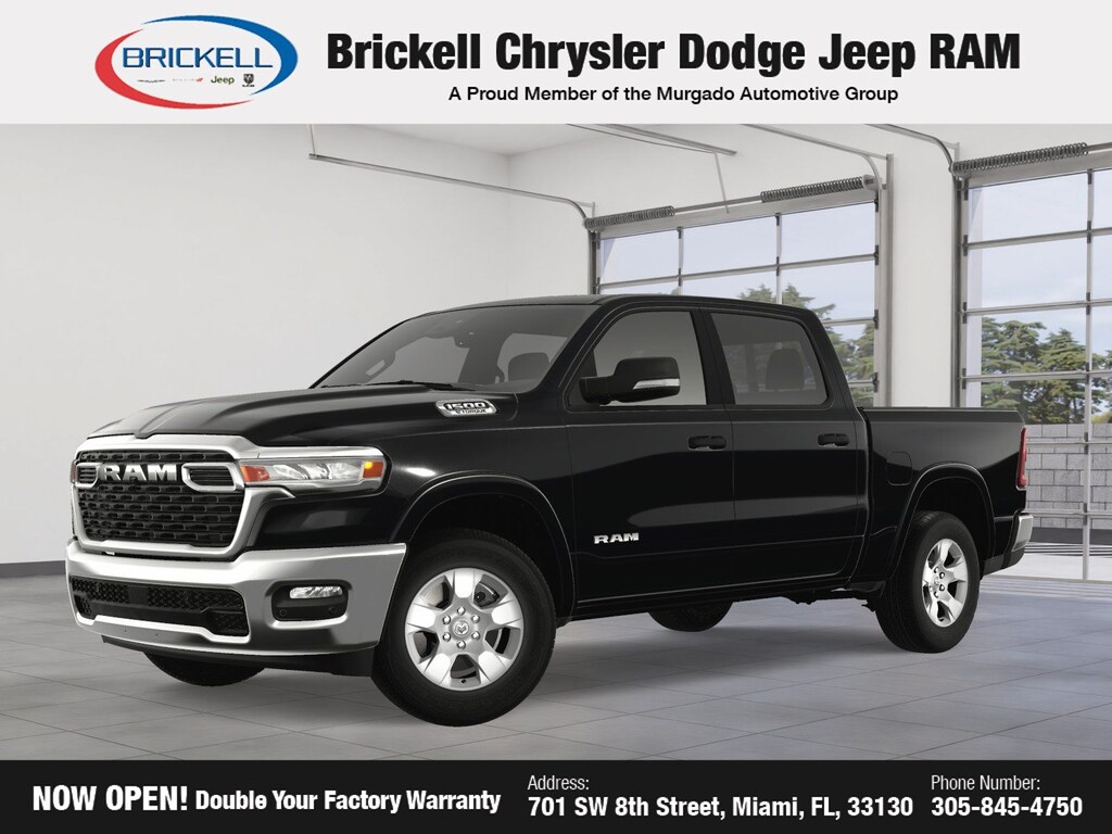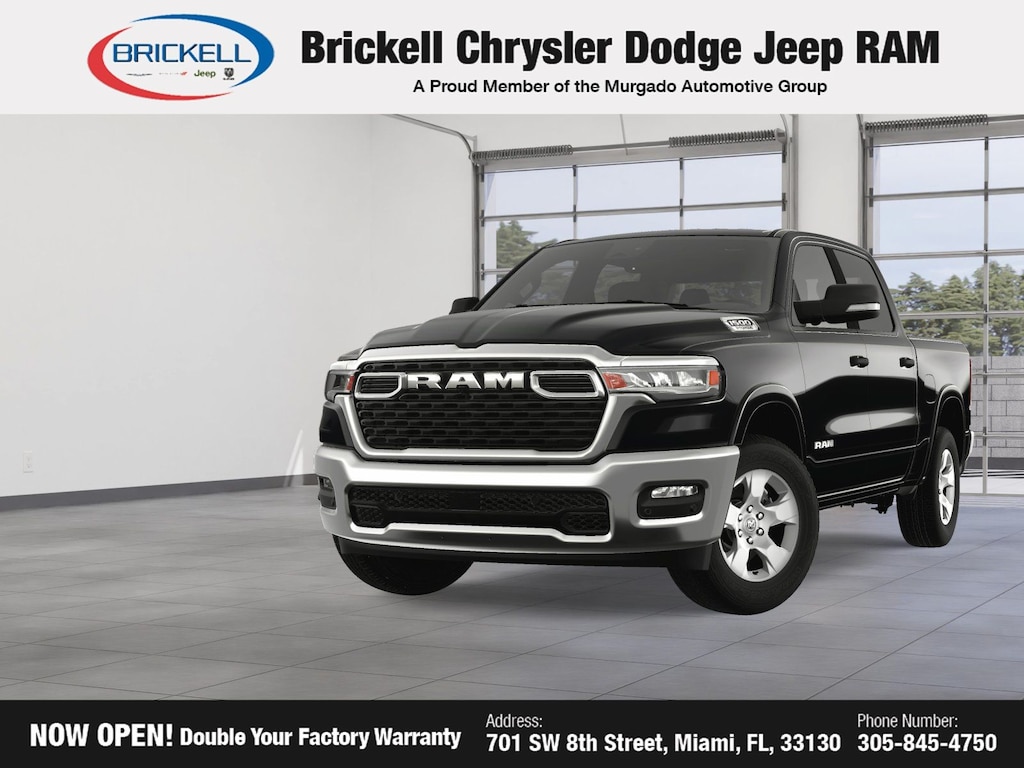 Price includes: $500 - 2025 National 2025 Military Bonus Cash. Exp. 01/05/2026 10% Msrp - 2025 National 10% Below MSRP . Exp. 11/03/2025 Discover Your Next Vehicle at Brickell Chrysler Dodge Jeep Ram Welcome to Brickell CDJR, where we go beyond selling cars. We double the factory powertrain warranty, giving you added peace of mind. Our dealership offers one of the largest new car inventories in the region, ensuring you find the right vehicle Prices displayed do not included our Perma-plate. Our state-of-the-art service department is the largest in the country and is open seven days a week from 7 AM to 9 PM. Visit us at 701 SW 8th St, Miami, FL 33130, or call 305-777-2800 to learn more and schedule a test drive. The displayed price includes an incentive for financing with Brickell CDJR Finance Company. Outside financing and bank drafts are not accepted. All pre-owned vehicle exports are subject to an export fee. Prices apply only to customers who live, work, or worship in Broward, Miami-Dade, Palm Beach, Monroe, Collier, Hendry, Lee, Glades, Martin, St. Lucie, Okeechobee, Manatee, Hillsborough, Osceola, or Orange County. Customers outside these counties will pay an additional $ Taxes, title, registration, and dealer fees apply. Factory MSRP: $57,155 Diamond Black Crystal Pearlcoat 2025 Ram 1500 Big Horn/Lone Star 4WD 8-Speed Automatic 3.6L V6 24V VVT