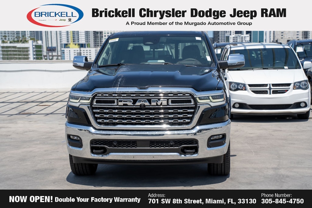Price includes: $500 - 2025 National 2025 Military Bonus Cash. Exp. 01/05/2026 $5250 - 2025 National Retail Consumer Cash. Exp. 12/01/2025 Discover Your Next Vehicle at Brickell Chrysler Dodge Jeep Ram Welcome to Brickell CDJR, where we go beyond selling cars. We double the factory powertrain warranty, giving you added peace of mind. Our dealership offers one of the largest new car inventories in the region, ensuring you find the right vehicle Prices displayed do not included our Perma-plate. Our state-of-the-art service department is the largest in the country and is open seven days a week from 7 AM to 9 PM. Visit us at 701 SW 8th St, Miami, FL 33130, or call 305-777-2800 to learn more and schedule a test drive. The displayed price includes an incentive for financing with Brickell CDJR Finance Company. Outside financing and bank drafts are not accepted. All pre-owned vehicle exports are subject to an export fee. Prices apply only to customers who live, work, or worship in Broward, Miami-Dade, Palm Beach, Monroe, Collier, Hendry, Lee, Glades, Martin, St. Lucie, Okeechobee, Manatee, Hillsborough, Osceola, or Orange County. Customers outside these counties will pay an additional $ Taxes, title, registration, and dealer fees apply. Factory MSRP: $87,585 Diamond Black Crystal Pearlcoat 2025 Ram 1500 Limited 4WD 8-Speed Automatic 3.0L I6
