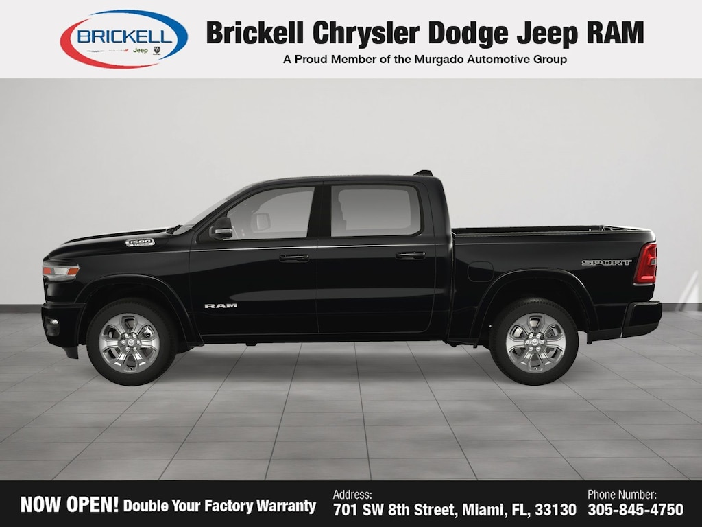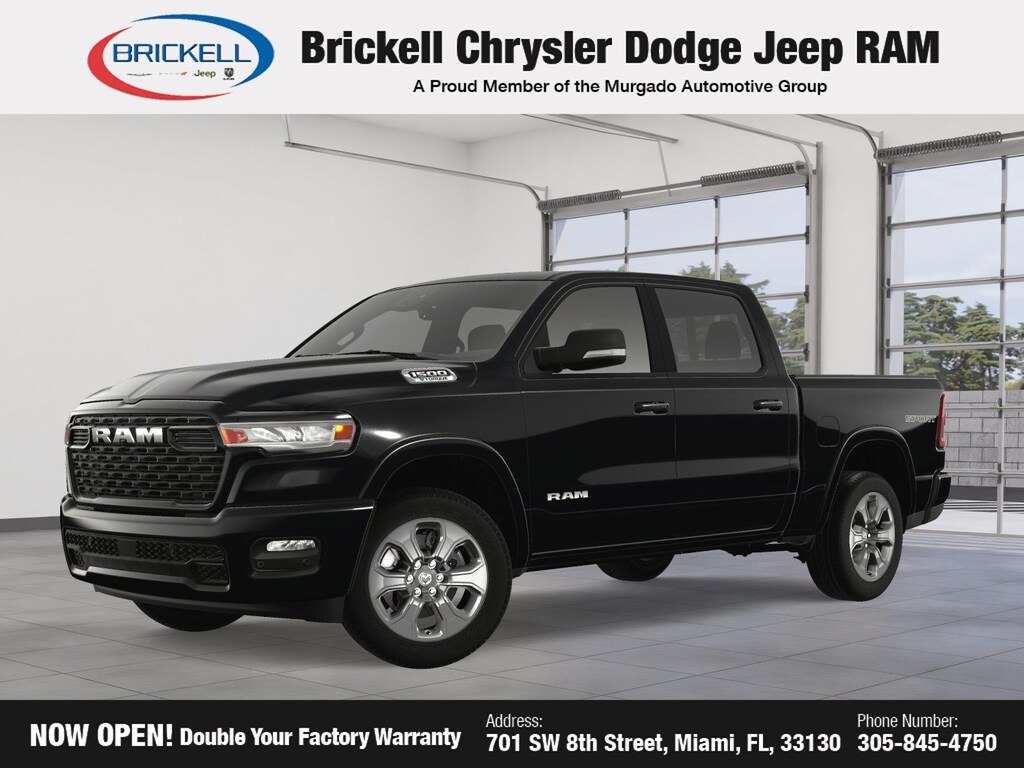 Price includes: $500 - 2025 National 2025 Military Bonus Cash. Exp. 01/05/2026 10% Msrp - 2025 National 10% Below MSRP . Exp. 11/03/2025 Discover Your Next Vehicle at Brickell Chrysler Dodge Jeep Ram Welcome to Brickell CDJR, where we go beyond selling cars. We double the factory powertrain warranty, giving you added peace of mind. Our dealership offers one of the largest new car inventories in the region, ensuring you find the right vehicle Prices displayed do not included our Perma-plate. Our state-of-the-art service department is the largest in the country and is open seven days a week from 7 AM to 9 PM. Visit us at 701 SW 8th St, Miami, FL 33130, or call 305-777-2800 to learn more and schedule a test drive. The displayed price includes an incentive for financing with Brickell CDJR Finance Company. Outside financing and bank drafts are not accepted. All pre-owned vehicle exports are subject to an export fee. Prices apply only to customers who live, work, or worship in Broward, Miami-Dade, Palm Beach, Monroe, Collier, Hendry, Lee, Glades, Martin, St. Lucie, Okeechobee, Manatee, Hillsborough, Osceola, or Orange County. Customers outside these counties will pay an additional $ Taxes, title, registration, and dealer fees apply. New Price! Factory MSRP: $55,460 Diamond Black Crystal Pearlcoat 2025 Ram 1500 Big Horn/Lone Star RWD 8-Speed Automatic 3.6L V6 24V VVT